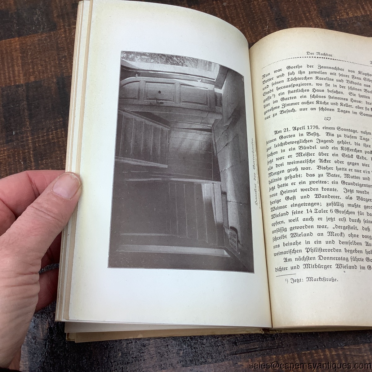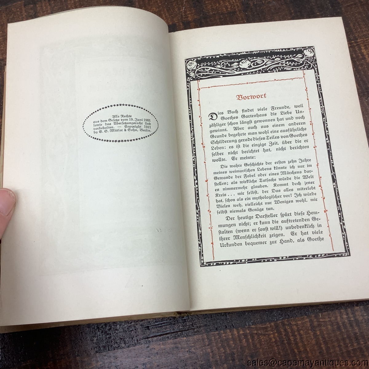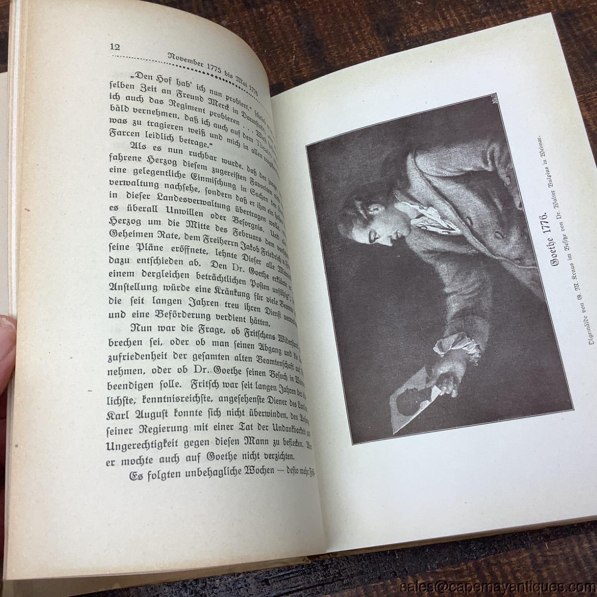 Very interesting German book titled Goethes Leben im Garten am Stern which is a collectible biography or historical account related to Johann Wolfgang van Goethe. The book is in German language. Hardcover with intricate botanical or art nouveau style border illustrations in green and red. 5.25" wide by 7.75" tall. Ex library copy from Philadephia, Carl Schurz Memorial Foundation Inc. 420 Chestnut St. Philadelphia. Pages are discolored from age, front page is disconnected. Lovely illustrations.