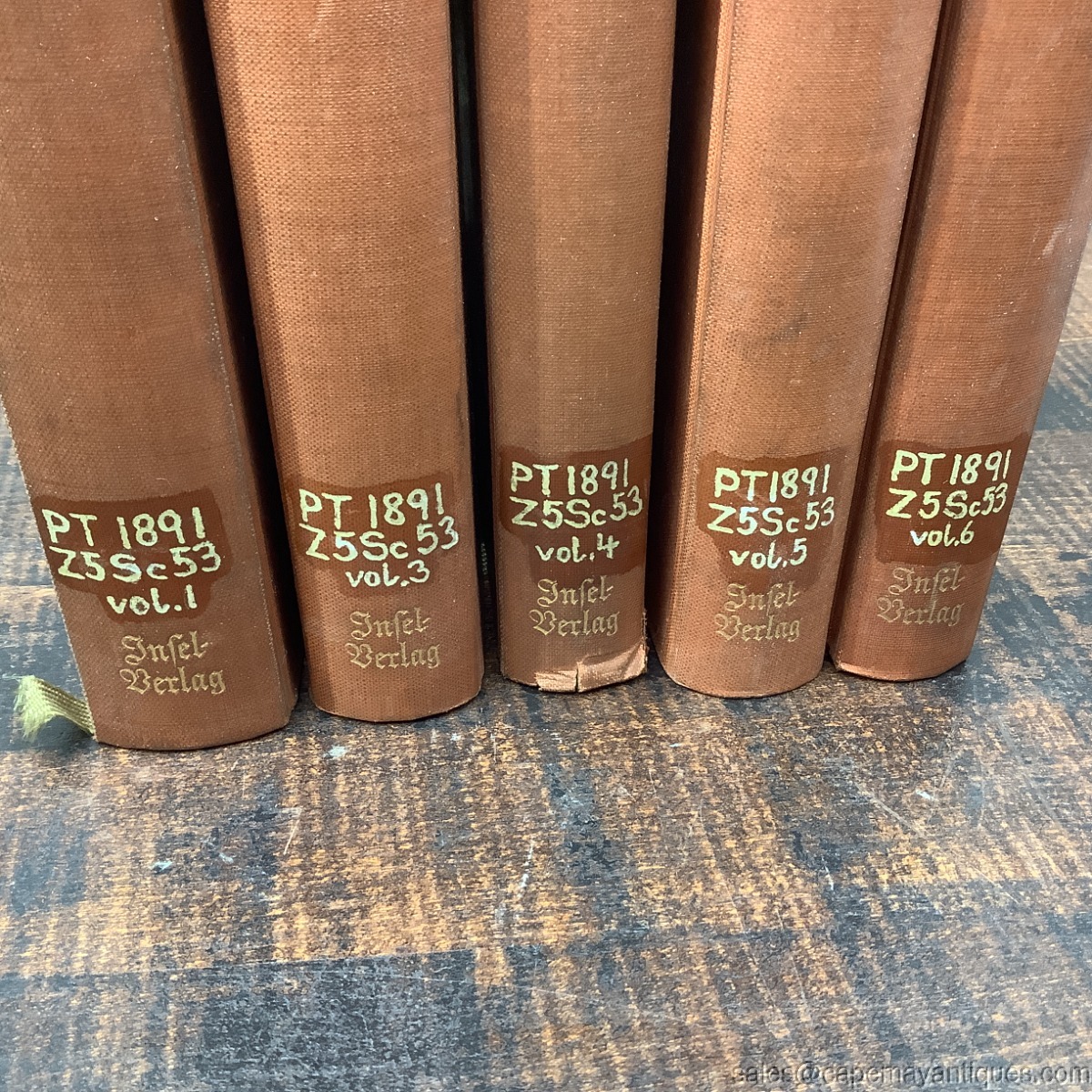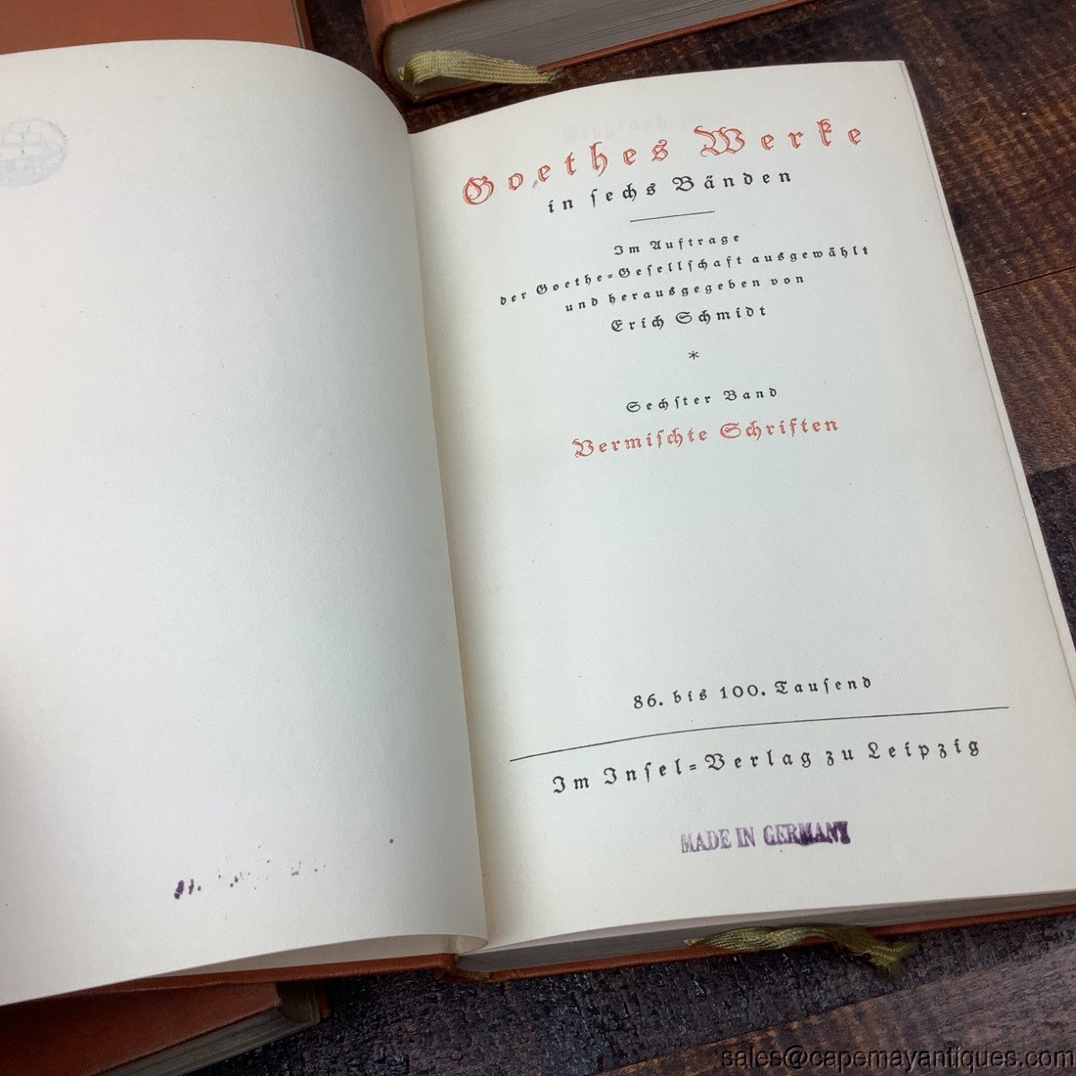 Wonderful 5 volume set, missing the 2nd volume of the works of Johann Wolfgang von Goethe. Titled Goethes Werke in Six Volumes. Again, I am missing the 2nd volume. Purchased at an auction with many other German books. THese are Made in Germany ex-libris, ex library from the Carl Schurze Memorial Foundation Inc., 420 Chestnut St, Philadelphia PA. Good condition for their age which I believe is around 1910 or so. As shown. No loose pages, some minor soiling, minor crack in spine of Volume 1, very minor in about 3 pages. These measure 7.5" height by 4.75" wide.