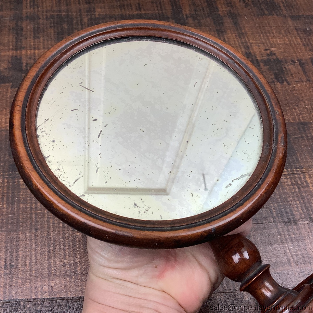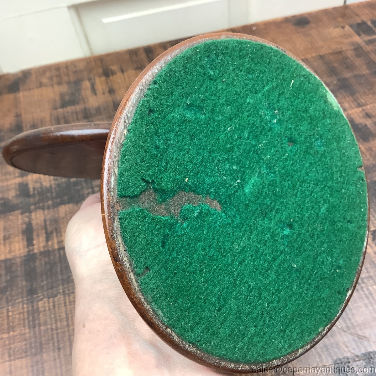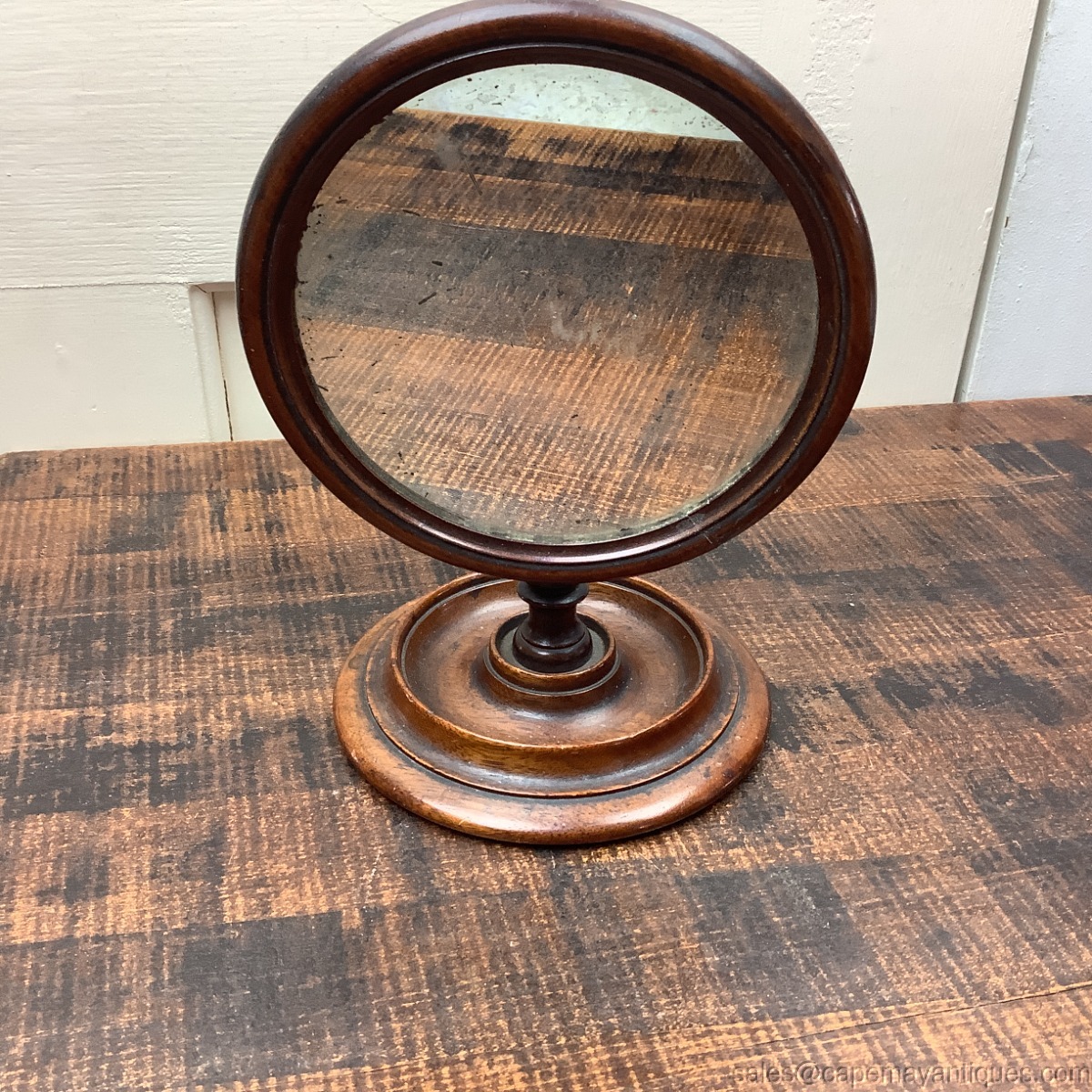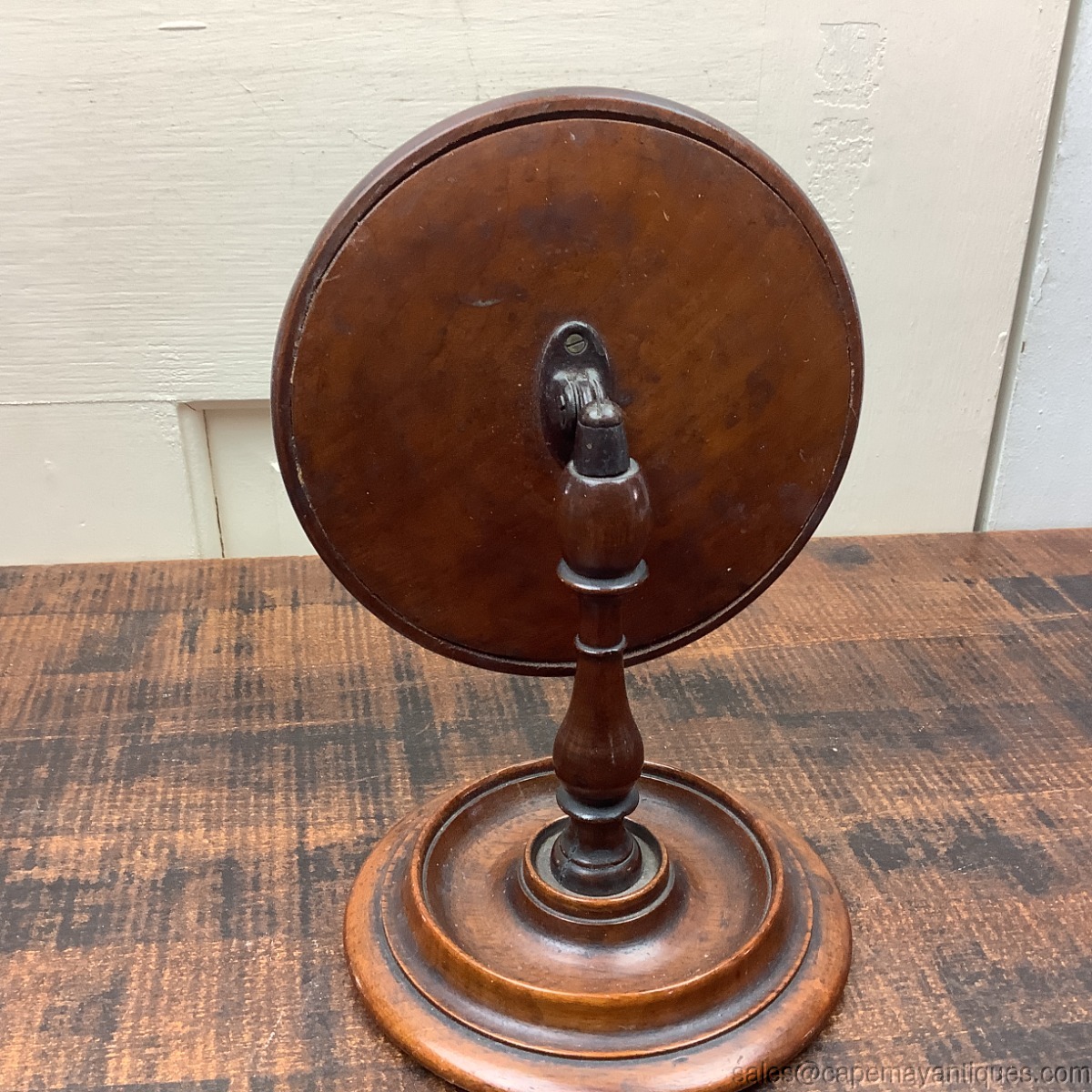 Stunning antique, Victorian era, gentlemen's tilting shaving stand mirror. Stands 8.5" tall. The mirror including trim is 6" wide. The base is 5" wide. Original mirror is in place with some marks, dark spots and wear, but no chips or cracks. I believe it is mahogany wood. Original green felt on bottom. Stunning collectible shaving stand great for bedroom or bath decor.
