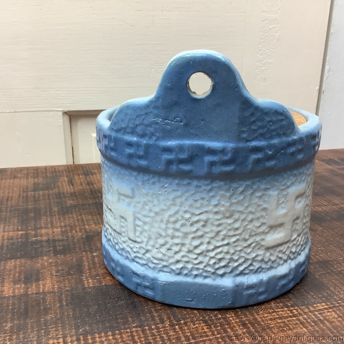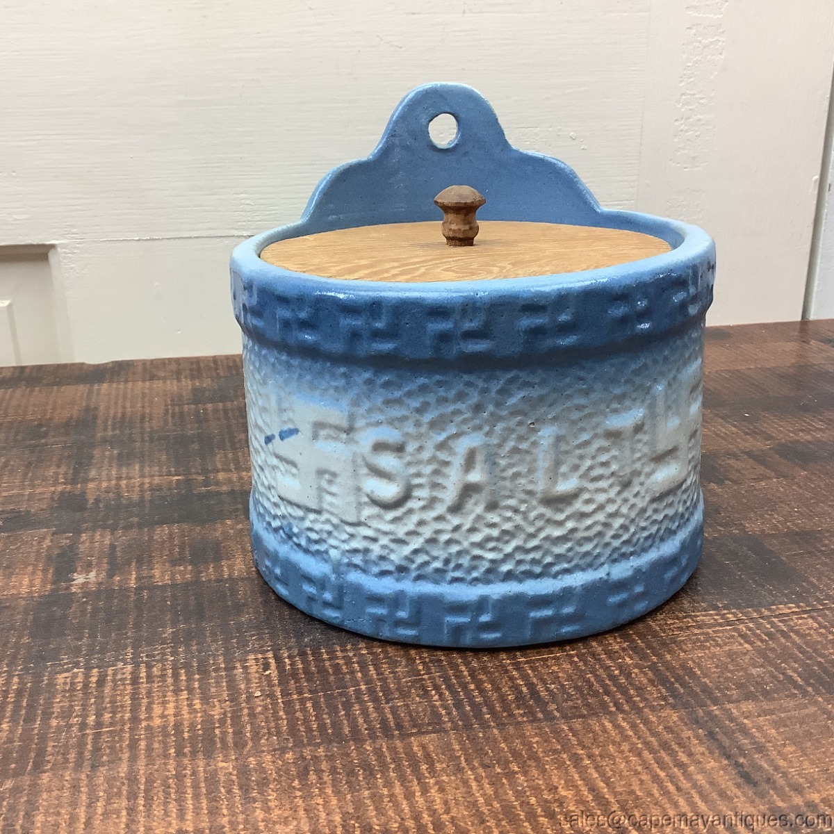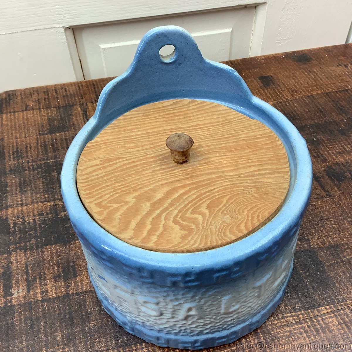 Antique blue and white round salt box with wood lid and opening on top back for wall hanging. This is decorated with whirling logs, a symbol for Good Luck in Indian history. The salt box is 6" wide by 6" tall and 4" from front to back. The wood lid is not original, but very old as well especially the nob. No chips or cracks. Really great antique stoneware piece!