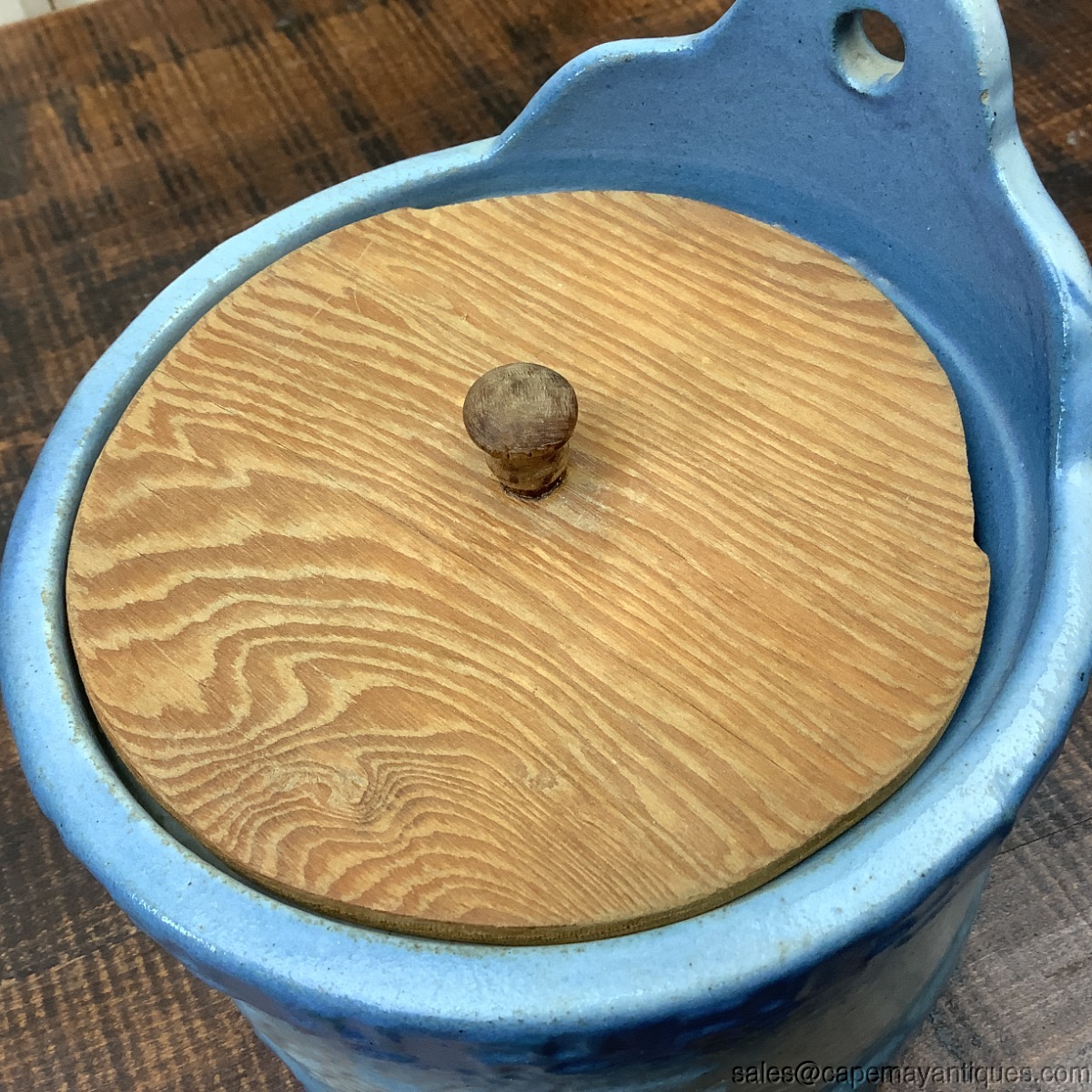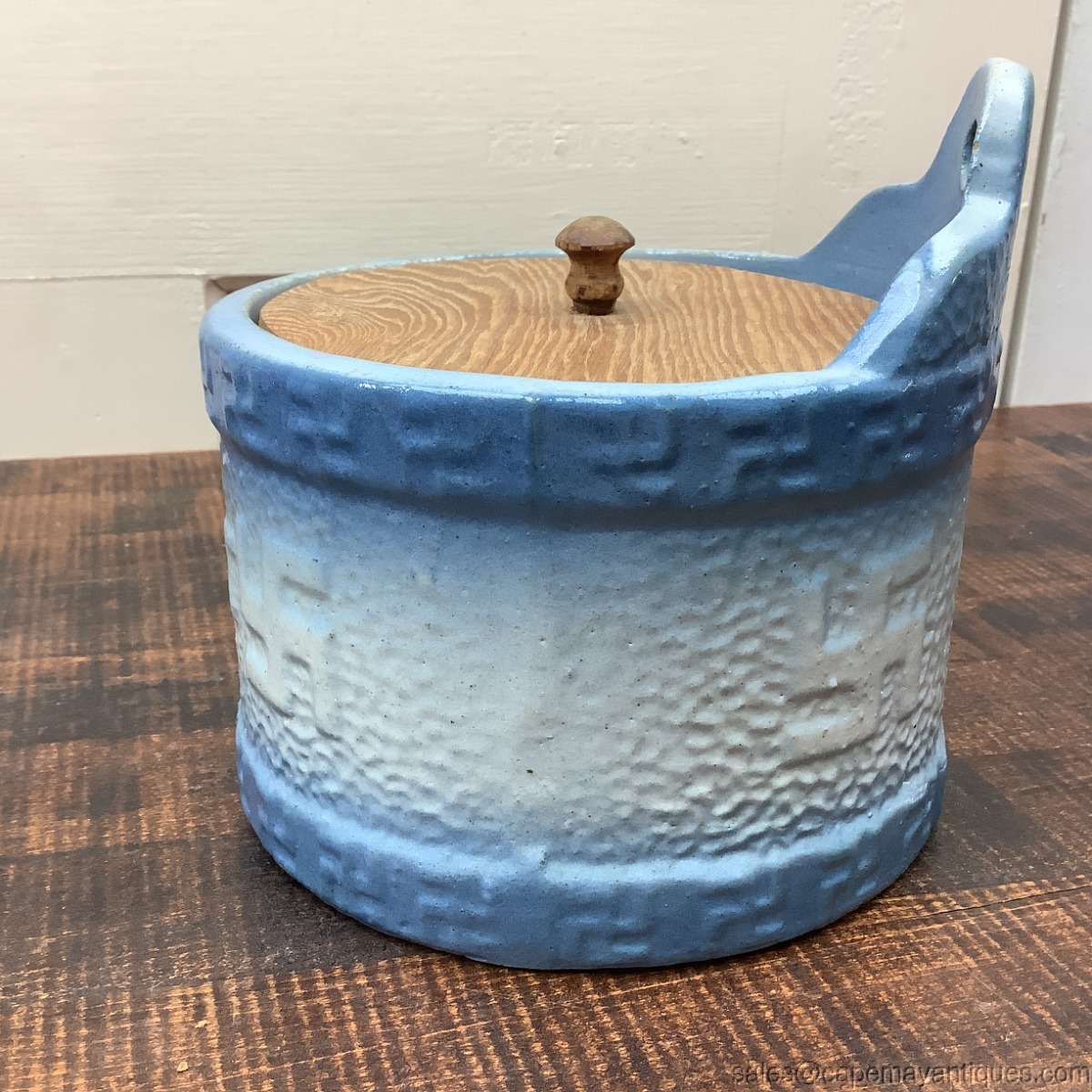 Blue and White Stoneware Salt Crock Replaced Wood Lid Good Luck Whirling Logs