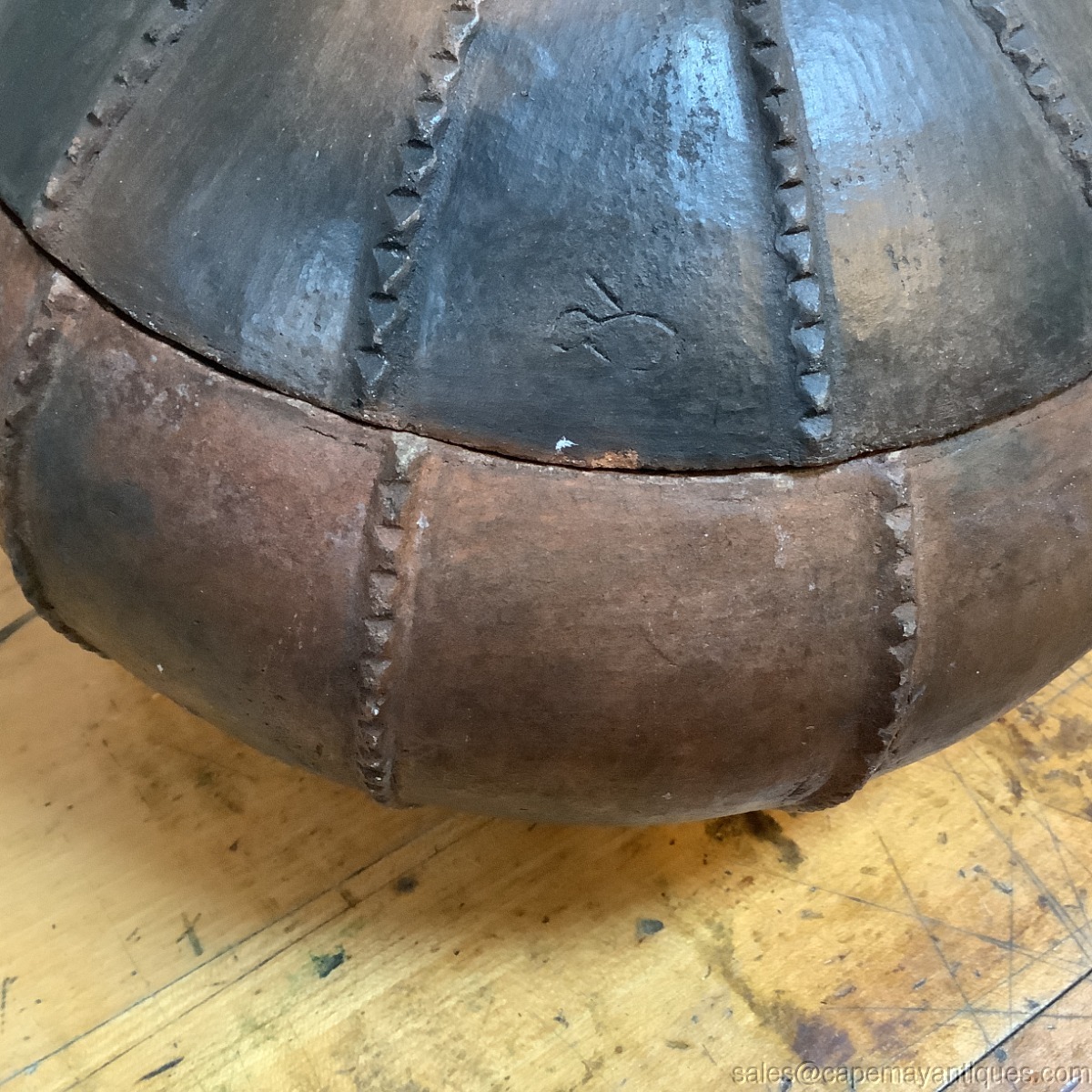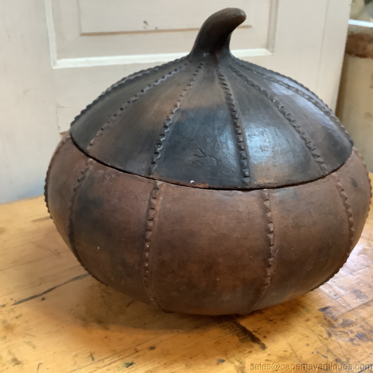 Lovely vintage terracotta 2 piece pumpkin bowl with lid. Earthenware, possibly hand crafted. Unmarked. 8" wide rim and 5.25" tall to rim add the lid and it's about 10" tall. Few tiny fleck chips on the lid and bottom sides, see photos. They show as red brown toned terracotta material. Neat piece with an arts crafts home vibe.