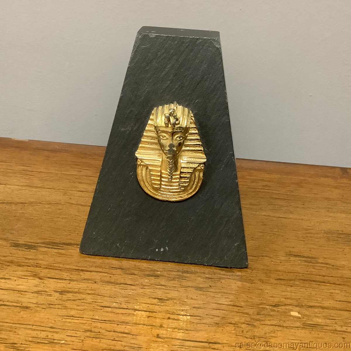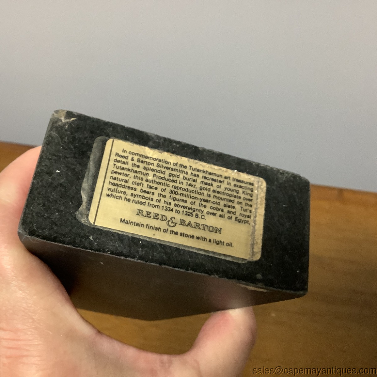 Reed & Barton stone pyramid with 14 K gold electroplated over pewter but or mask. Stone is not marked but original label indicates it should be treated with light oil. Few minor marks on the stone. NO major damage or wear. Stands 4.75 Tall by 3.75" wide and 2" deep at the base.