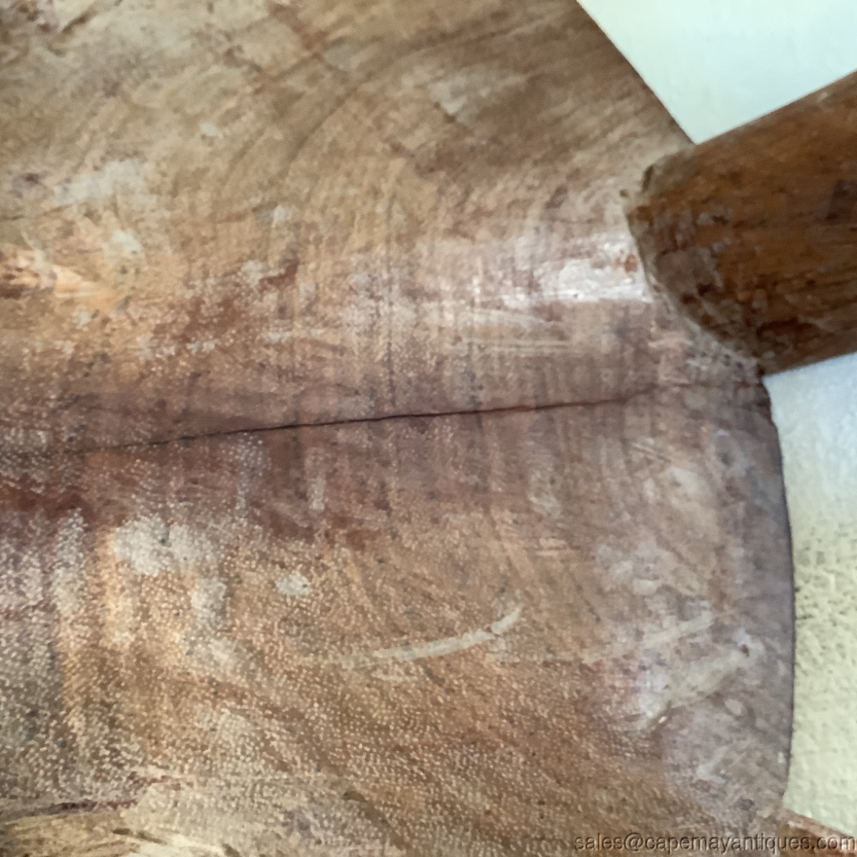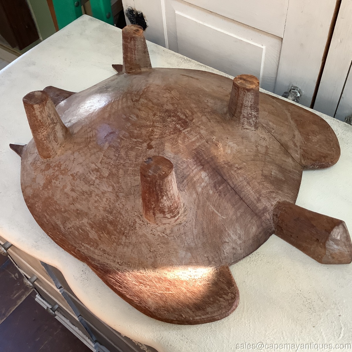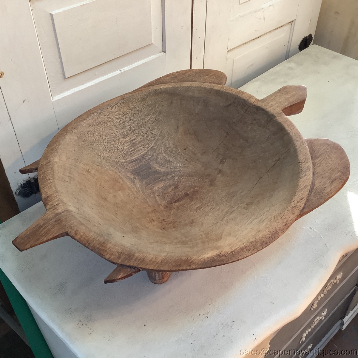 Gorgeous hand carved large wood turtle bowl. Origin is unknown. Unmarked, no signature. Found at local auction. Large measuring 25.5" length by 18" wide and 5.5" tall. The bowl size is about 16" by 17". Fill with shells or other nautical decor. There are some natural splits in the wood in the bowl section See up photos. Good and sturdy though.