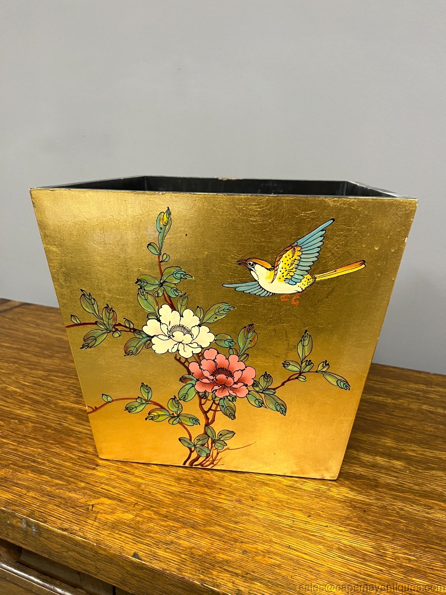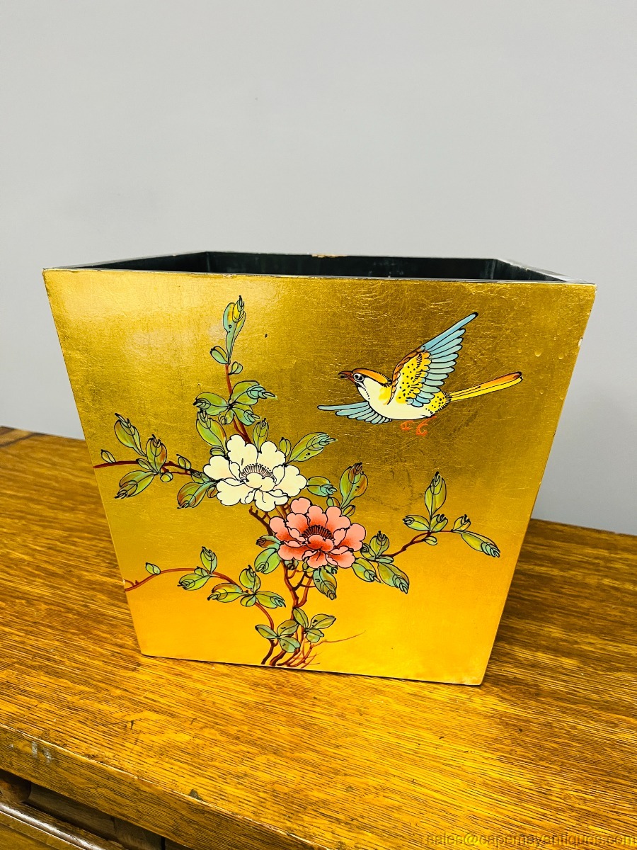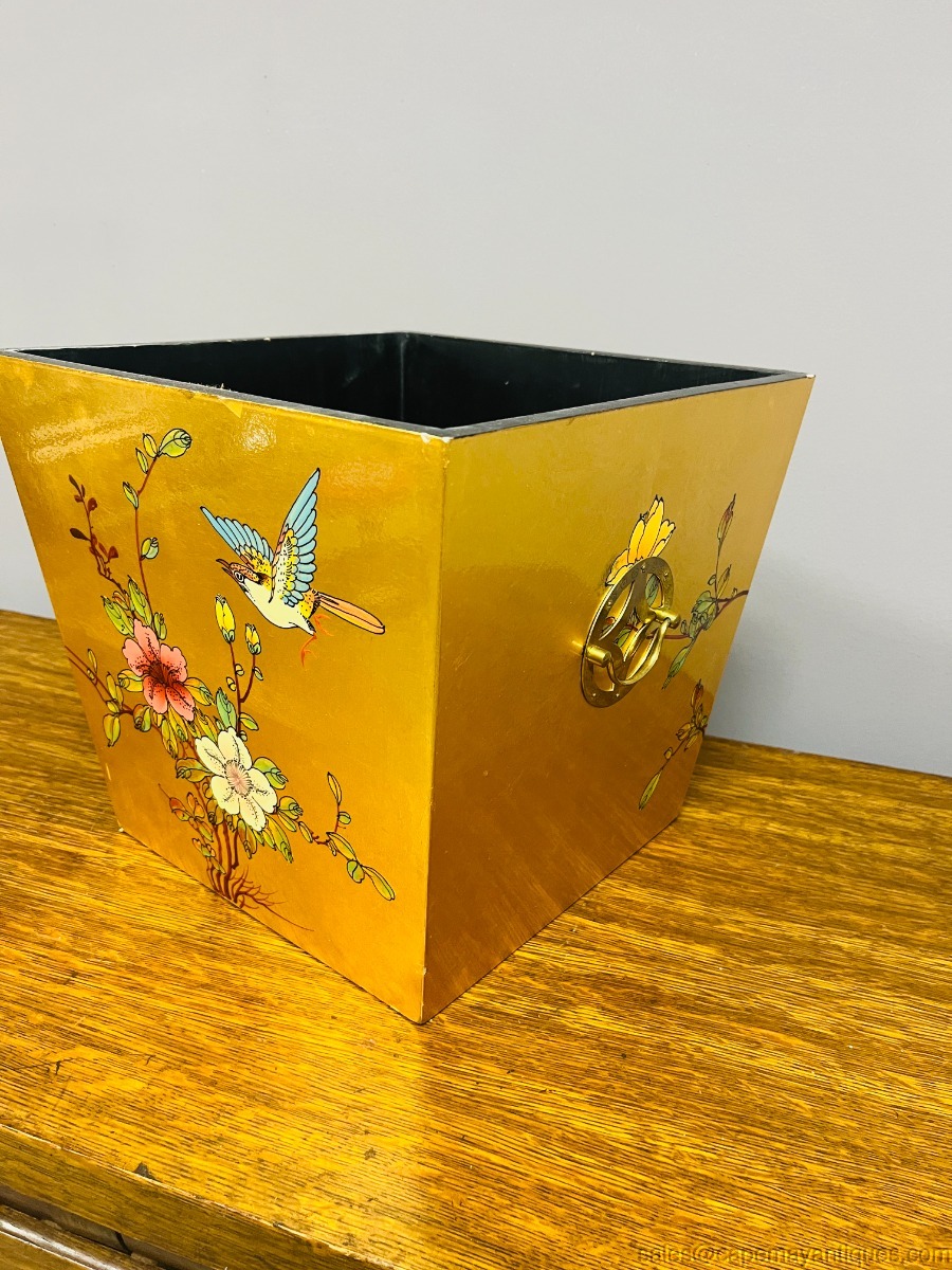 Gorgeous lacquered open box with double handles. The exterior is lacquered in a gold shade with brass handles on 2 sides. All four sides are decorated with flower pattern and front and back feature a blue bird approaching a carnation bush. The box is 12" by 12" wide at top by 11" tall. Graduating to a smaller base 9.5" square. Vintage in age, no makers information. There is some wear to the black rim with marks and missing black finish here and there. One small gold section appears to have been touched up as well. Great for storage of magazines, newspapers, even kindling wood would work here. Trash can etc.