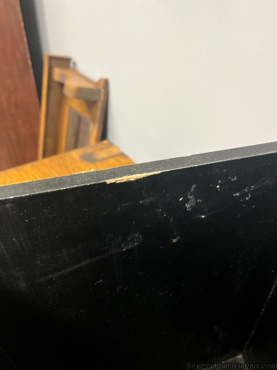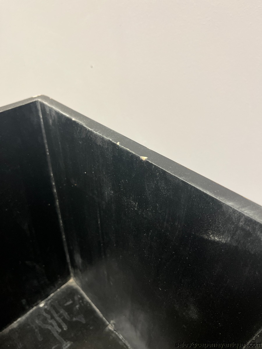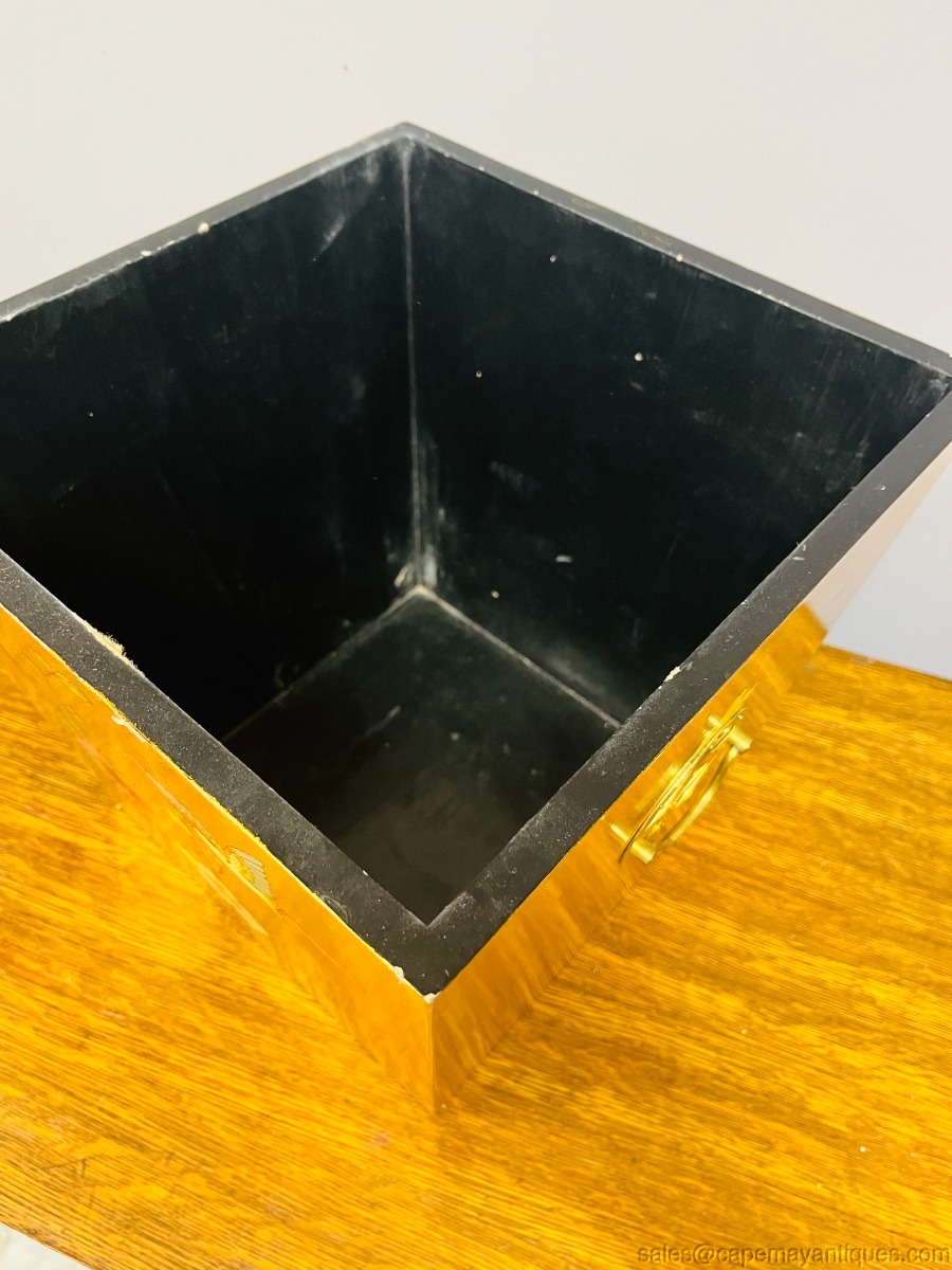 Gorgeous lacquered open box with double handles. The exterior is lacquered in a gold shade with brass handles on 2 sides. All four sides are decorated with flower pattern and front and back feature a blue bird approaching a carnation bush. The box is 12" by 12" wide at top by 11" tall. Graduating to a smaller base 9.5" square. Vintage in age, no makers information. There is some wear to the black rim with marks and missing black finish here and there. One small gold section appears to have been touched up as well. Great for storage of magazines, newspapers, even kindling wood would work here. Trash can etc.