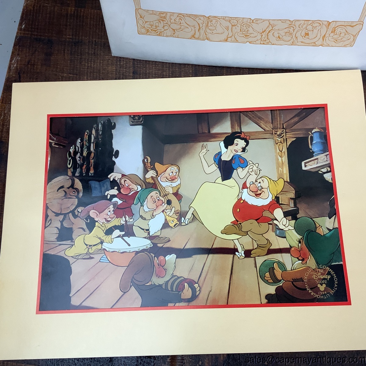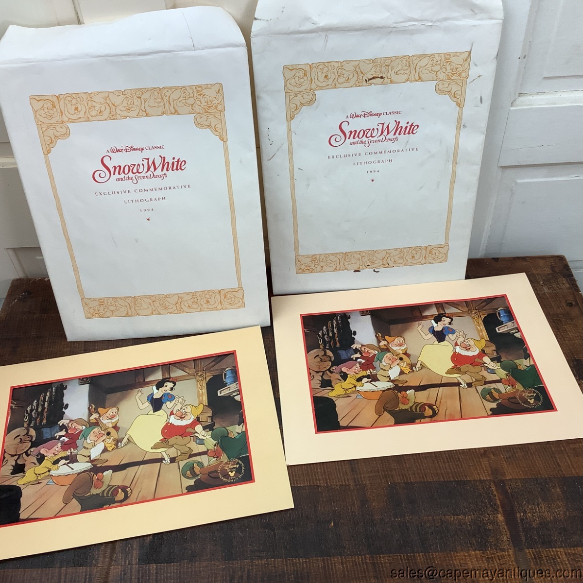 In original envelopes, there are 2 Exclusive Commemorative Lithographs 1994 Snow White and the Seven Dwarfs. Each lithograph in its matting measures 16" x 12". The litho itself is 12.5" by 8.5". Good condition, protected and kept in envelope for over 30 years!