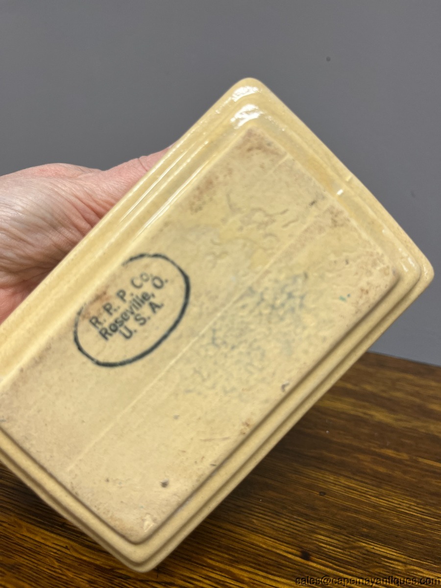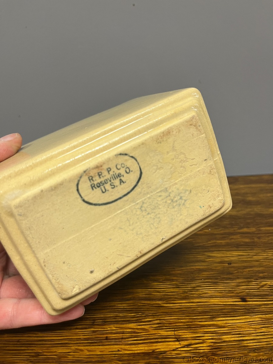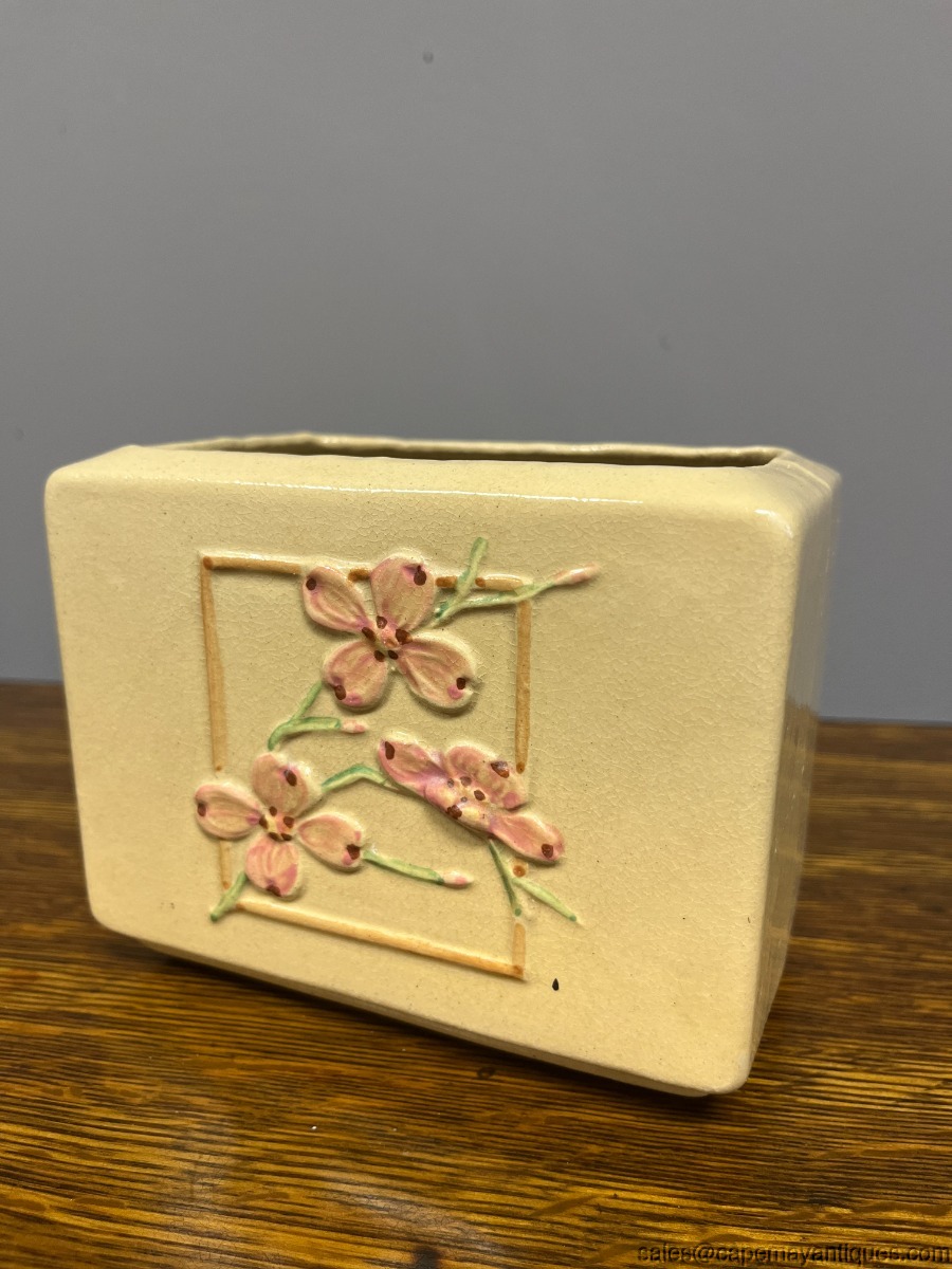 Lovely vintage Roseville RRPC pottery planter. Made in Ohio, USA. 5.5" length by 4.5"t all and 3.5" wide. Pretty front pattern of pink dogwood flowers or branches. Beige tone background. Good condition with no chips. Tiny small hairline crack on rim, very thin and small. Overall, very good condition for it's age.