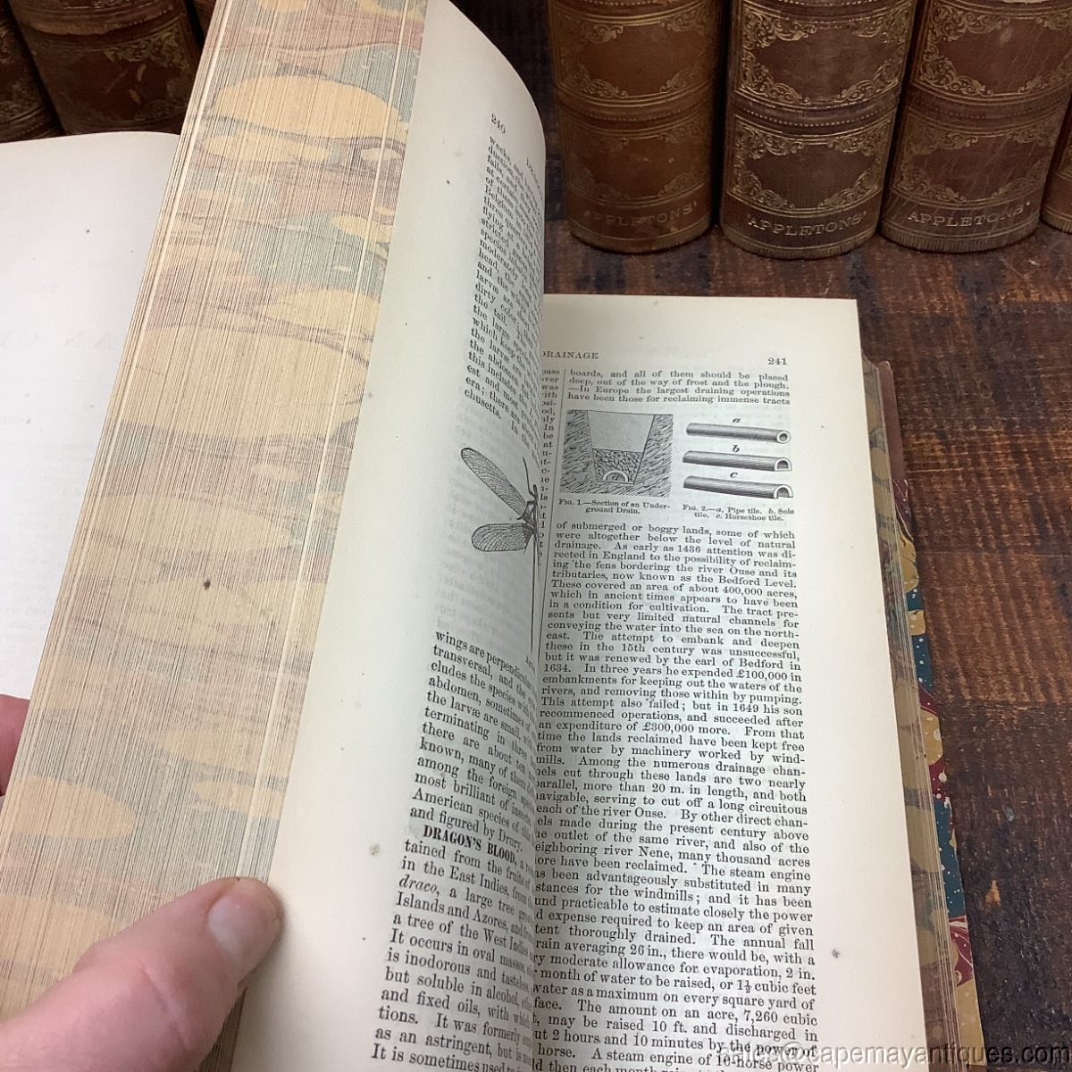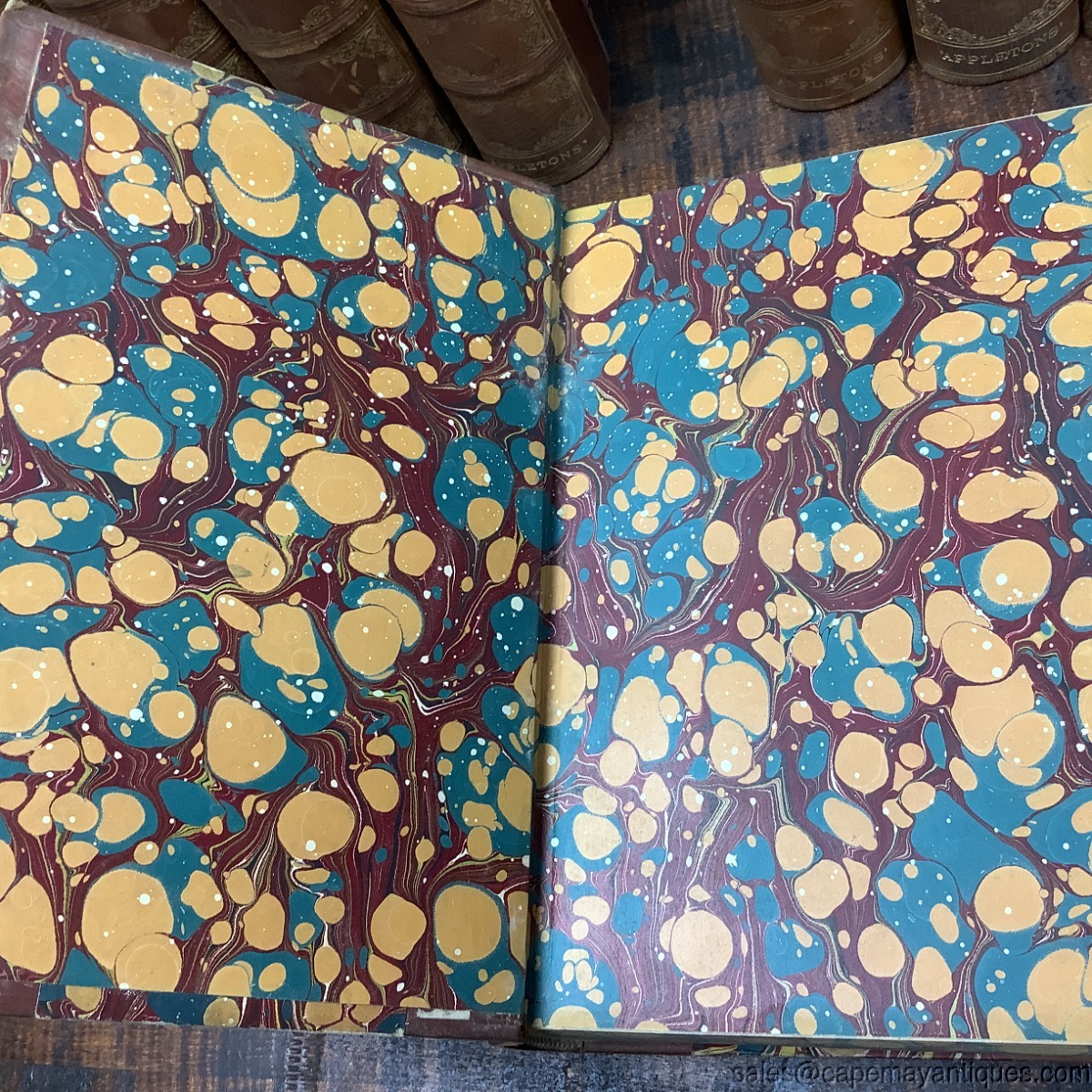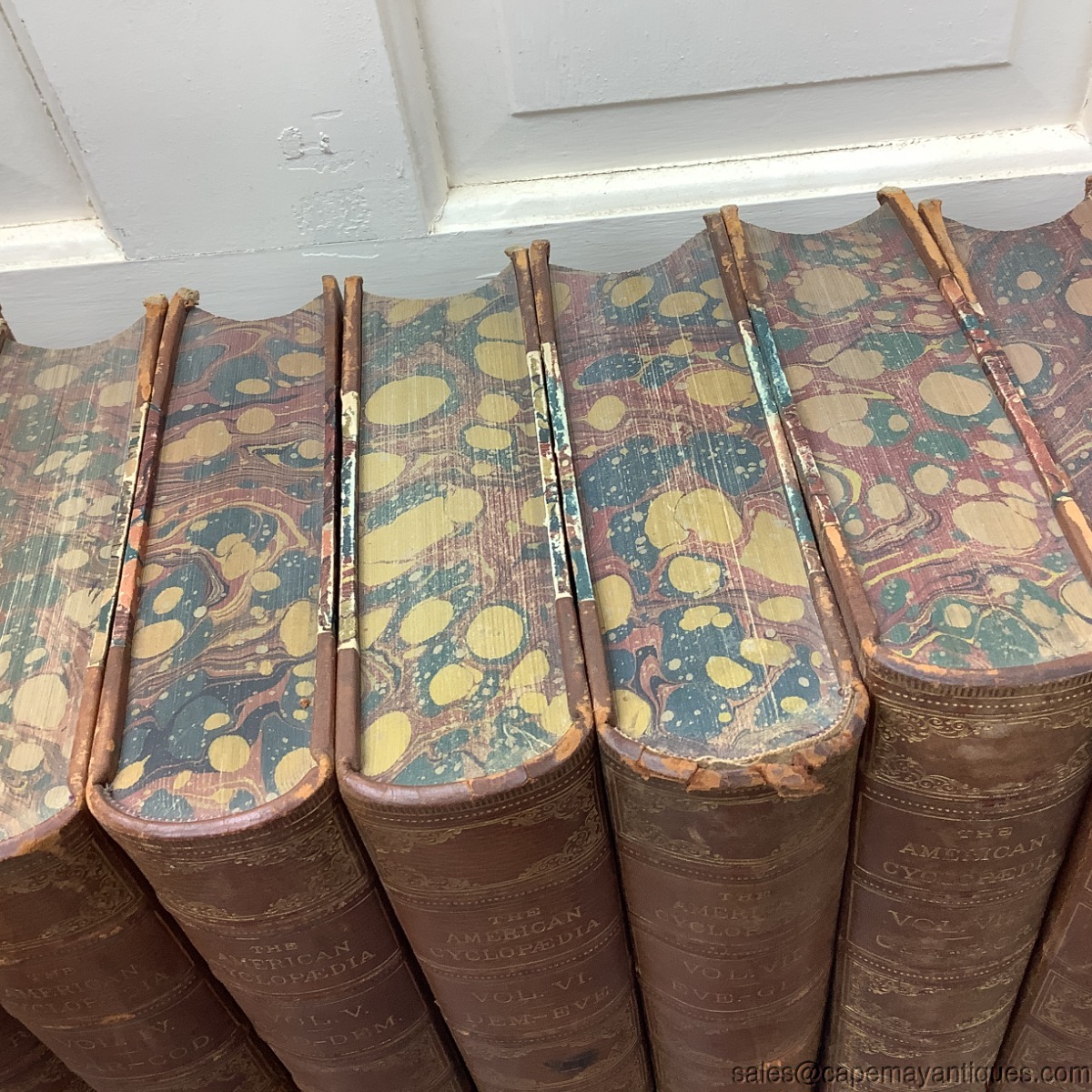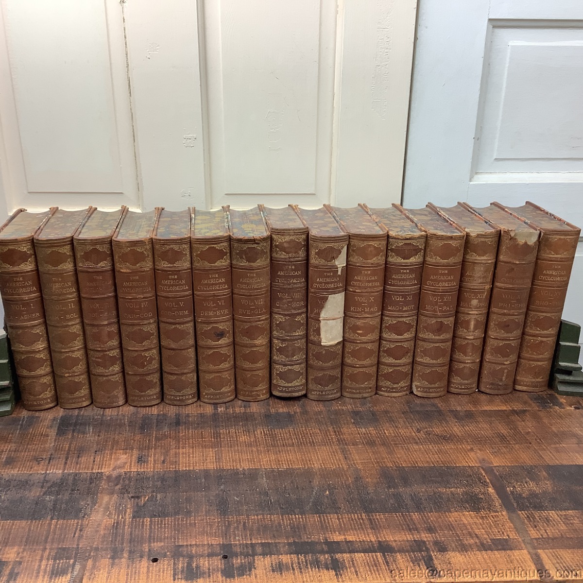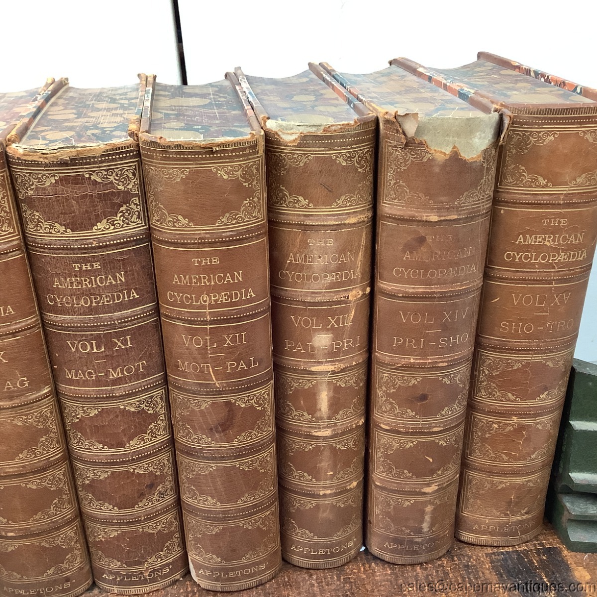 The American Cyclopedia: A Popular Dictionary of General Knowledge. Edited by George Ripley and Charles A. Dana. Volumes 1 through 15. First Volume Dated 1873. Last volume dated 1876. Each book is 10" tall by 7" wide. These are 1/4 leather bound at their spine as well as all 4 corners front and back. Interior front and back pages feature a colorful marble pattern which is also found on the closed book end pages, as well as to and bottom. Overall, good condition with little to no damage. Pages are good with no dog ears, rips etc. There are age spots on some front pages. Volume 9 has the worse condition at the binding with missing leather sections. Volumes 11, 12 have minor damage at top edge of binding and 13 has more significant loss at binding top. See images. Minor wear top top edges of front and back covers. Very minor considering there age.