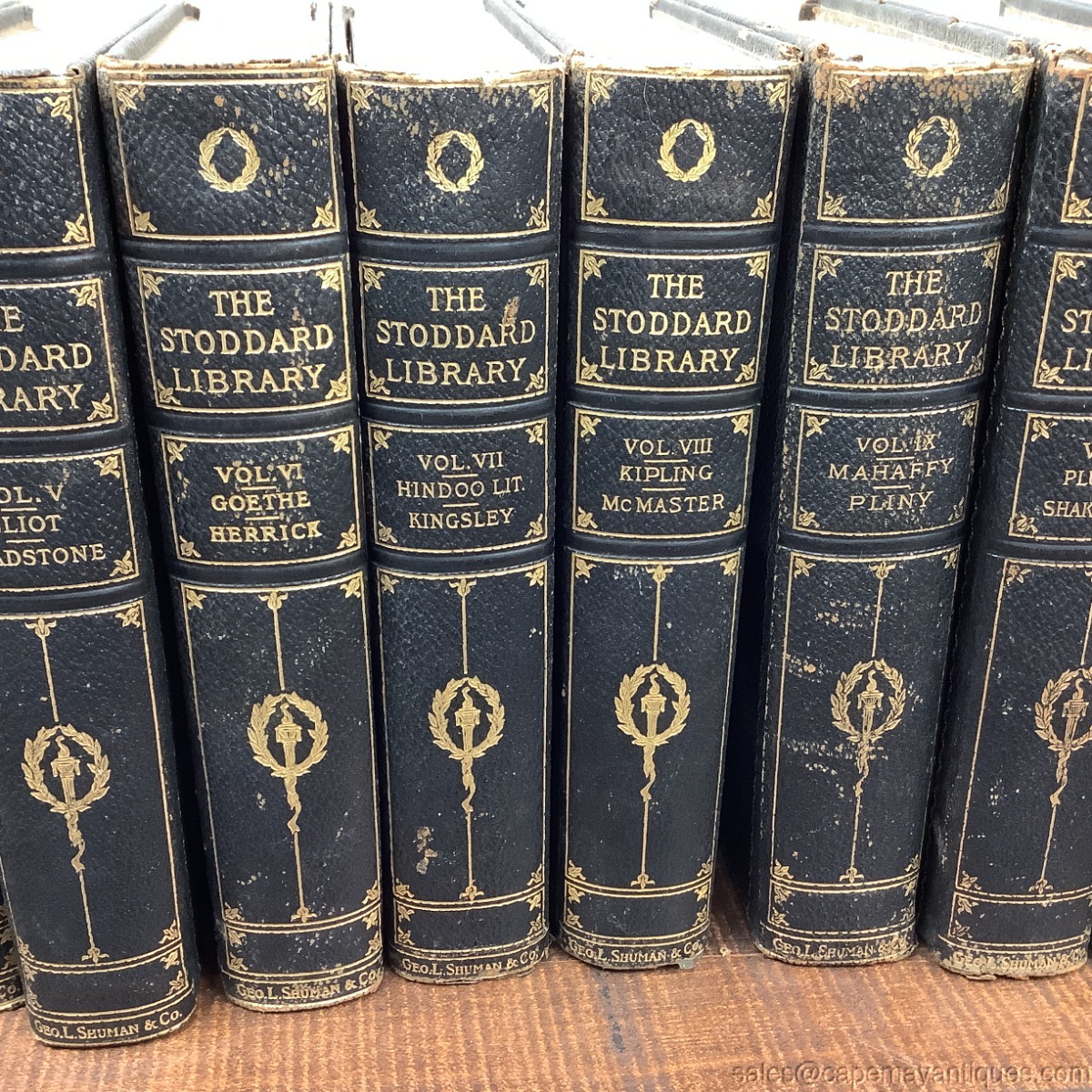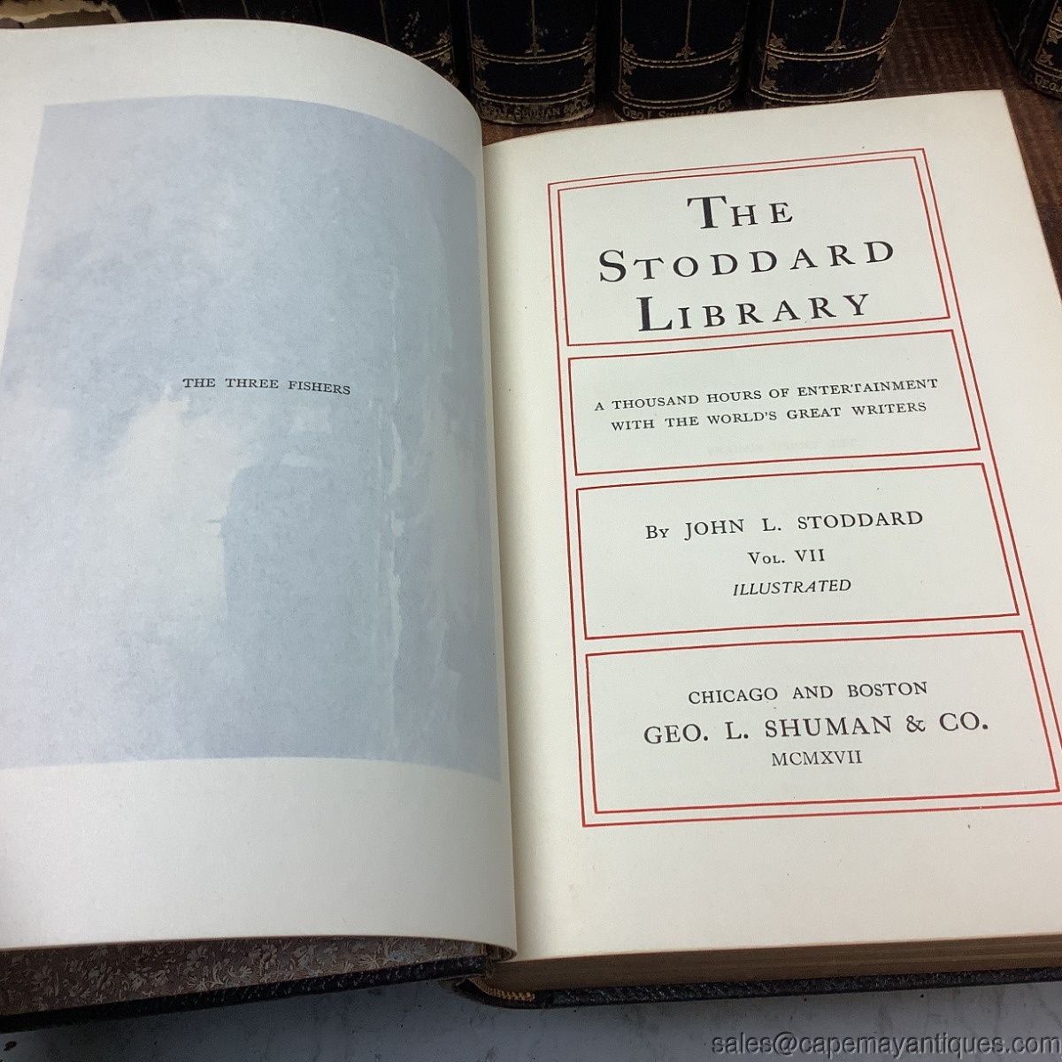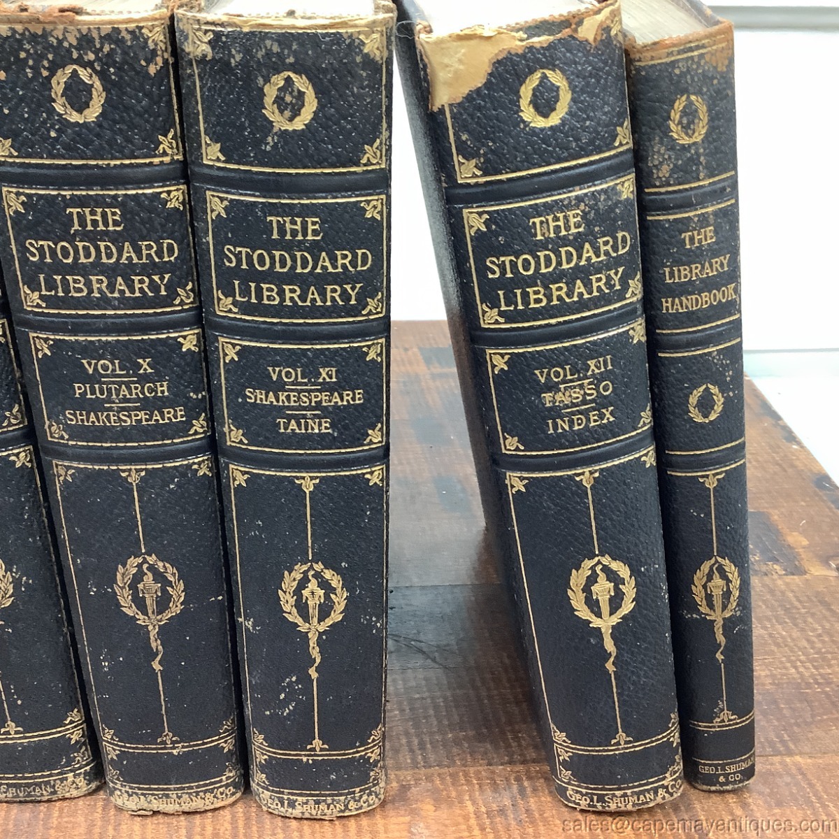 Wonderful set of The Stoddard Library volumes 1 through 12. A thousand hours of entertainment with the world's greatest writers. Stunning colored illustrations in each volume. Set includes, the Library Handbook. Pretty blue and gold inscribed hard covers on each. Leather binding, full leather on front and back covers as well. There is some wear to the top binding, bottoms, from use, one book has creased pages at the top edges. Volume one has almost completely detached binding. You will find scuffs and marks and worn corners of fronts and backs here and there but overall, good condition.