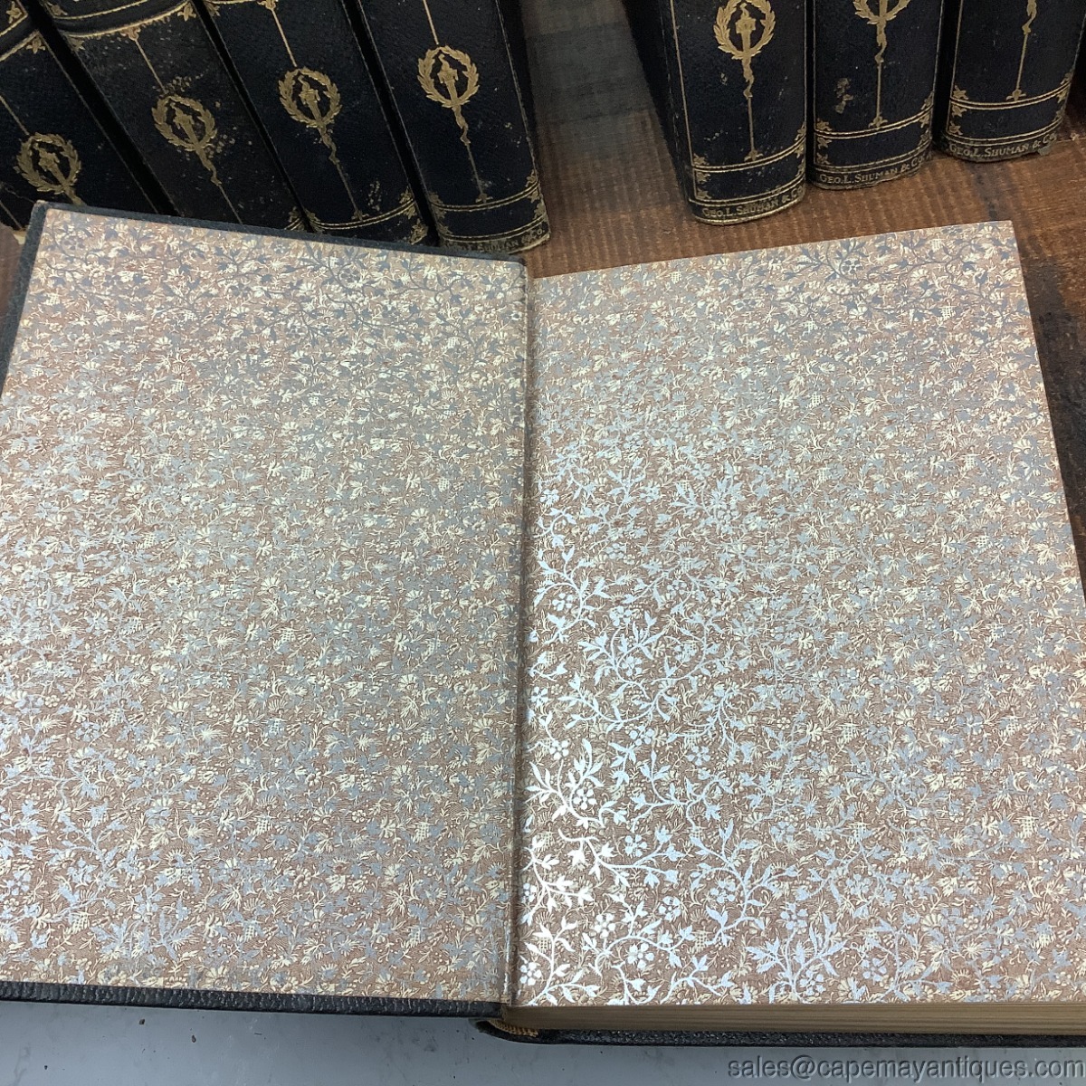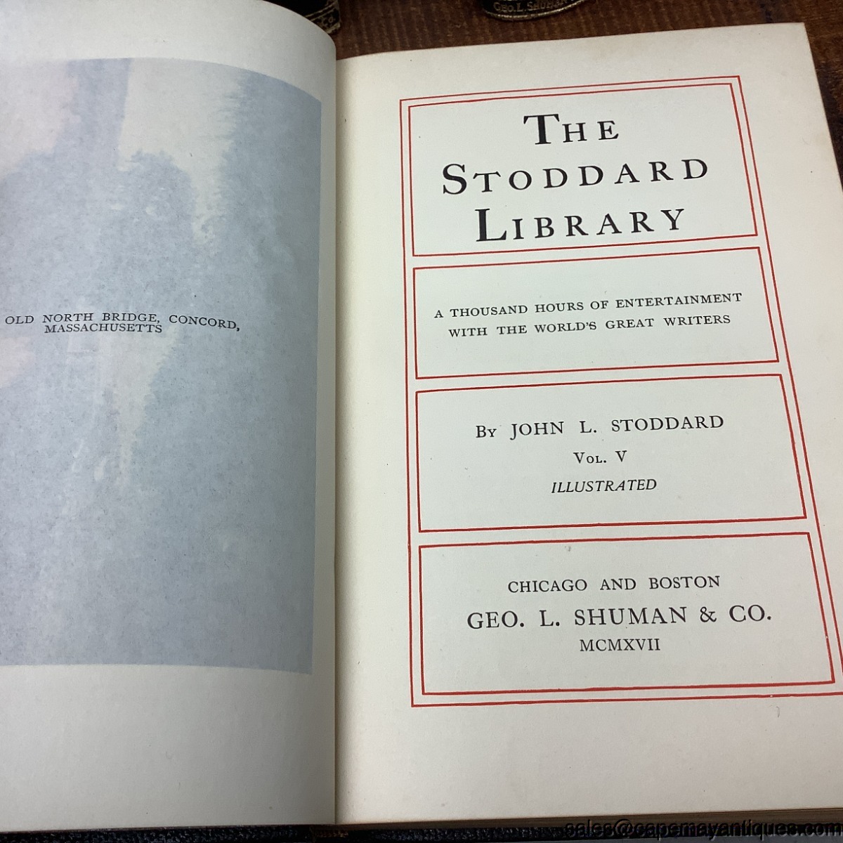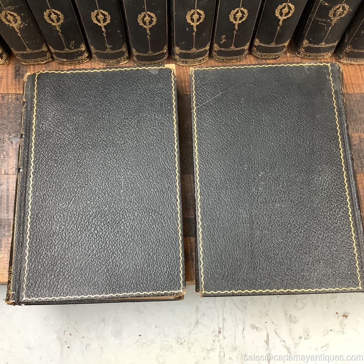 Wonderful set of The Stoddard Library volumes 1 through 12. A thousand hours of entertainment with the world's greatest writers. Stunning colored illustrations in each volume. Set includes, the Library Handbook. Pretty blue and gold inscribed hard covers on each. Leather binding, full leather on front and back covers as well. There is some wear to the top binding, bottoms, from use, one book has creased pages at the top edges. Volume one has almost completely detached binding. You will find scuffs and marks and worn corners of fronts and backs here and there but overall, good condition.