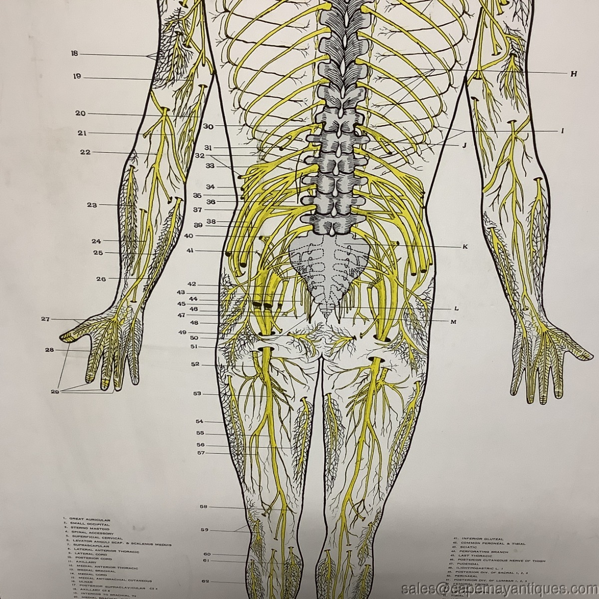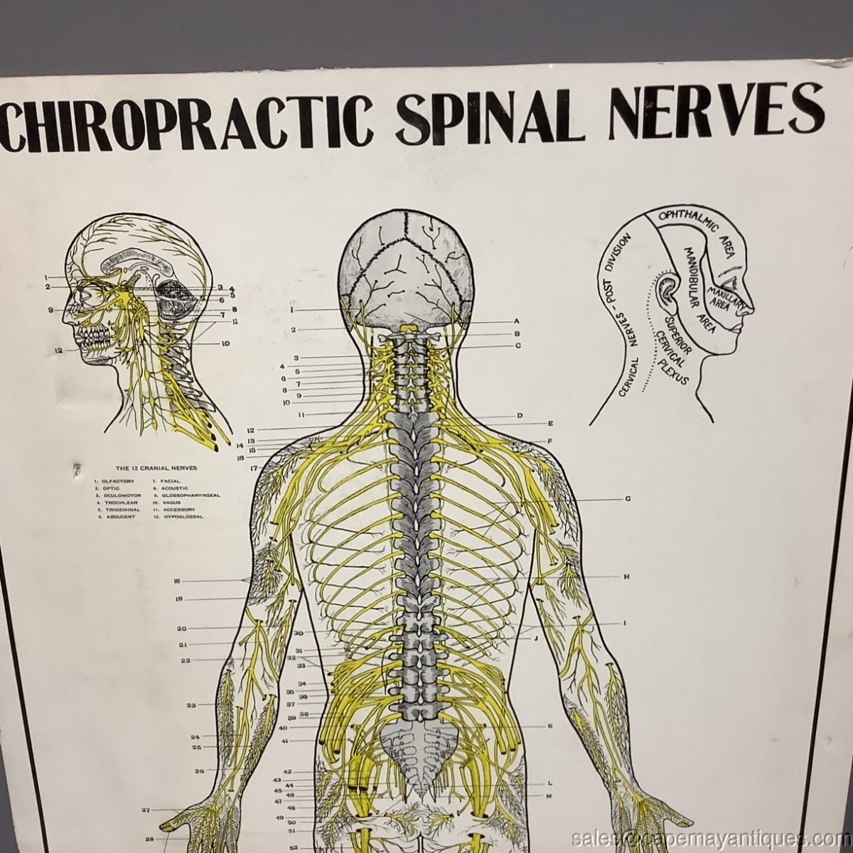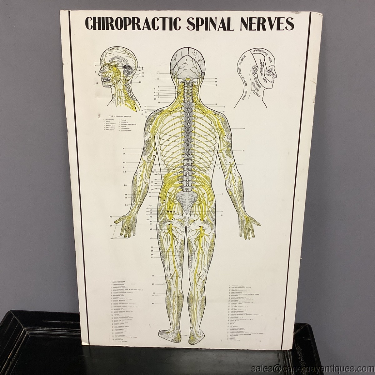 Neat vintage or older Chiropractic Spinal Nerves posterboard measuring 20" wide by 30" tall. Yellow spinal nerves on black and white body figure diagram notes. Good condition with small tear and impressions upper left side near Cranial Nerves diagram. See images. Very interesting actually. Now I see why my back hurts so bad!