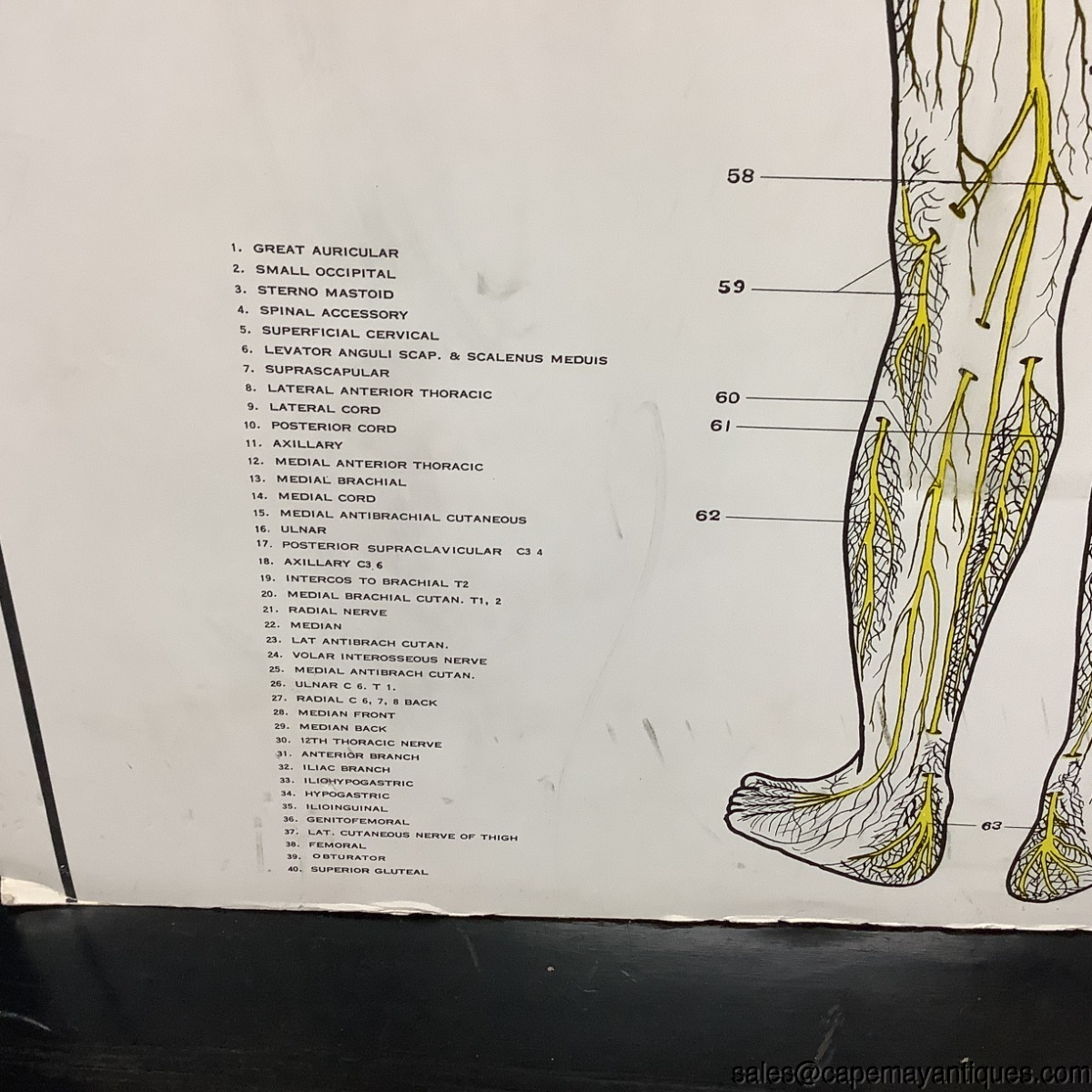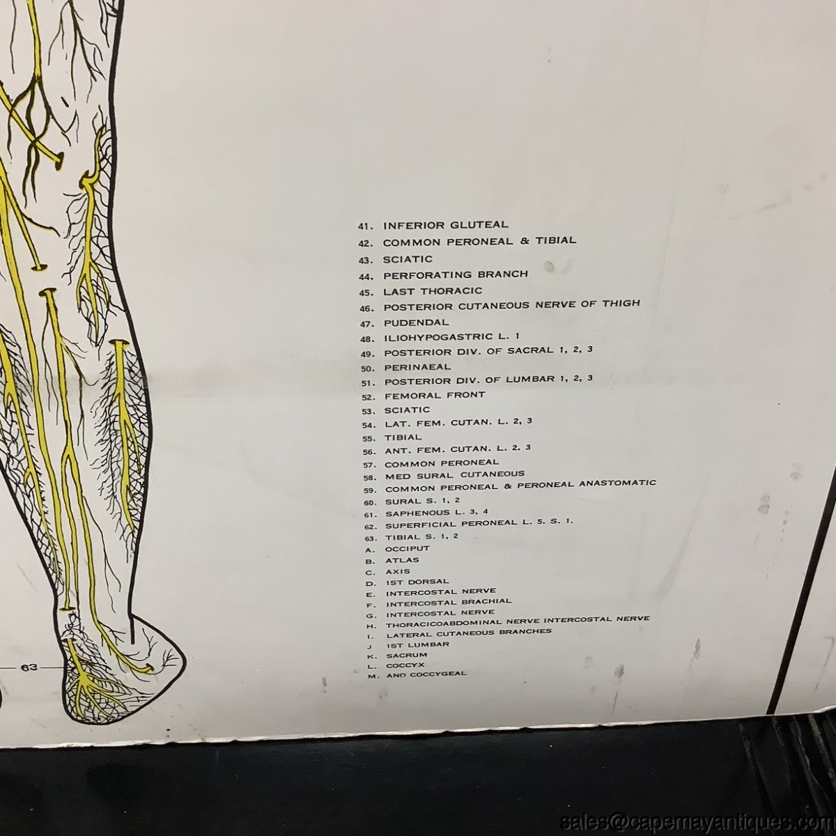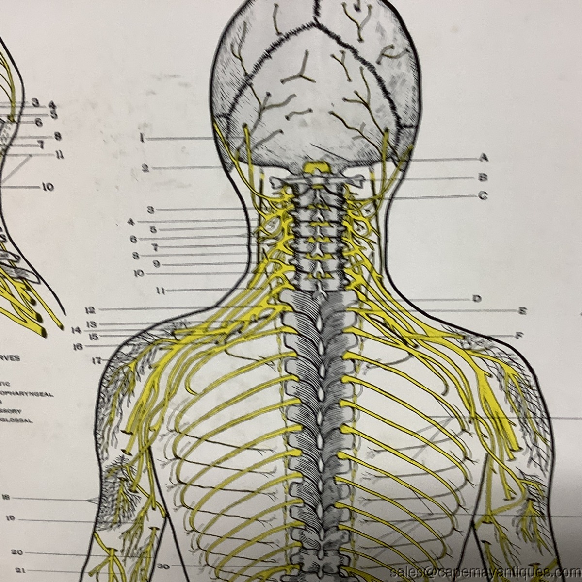 Neat vintage or older Chiropractic Spinal Nerves posterboard measuring 20" wide by 30" tall. Yellow spinal nerves on black and white body figure diagram notes. Good condition with small tear and impressions upper left side near Cranial Nerves diagram. See images. Very interesting actually. Now I see why my back hurts so bad!