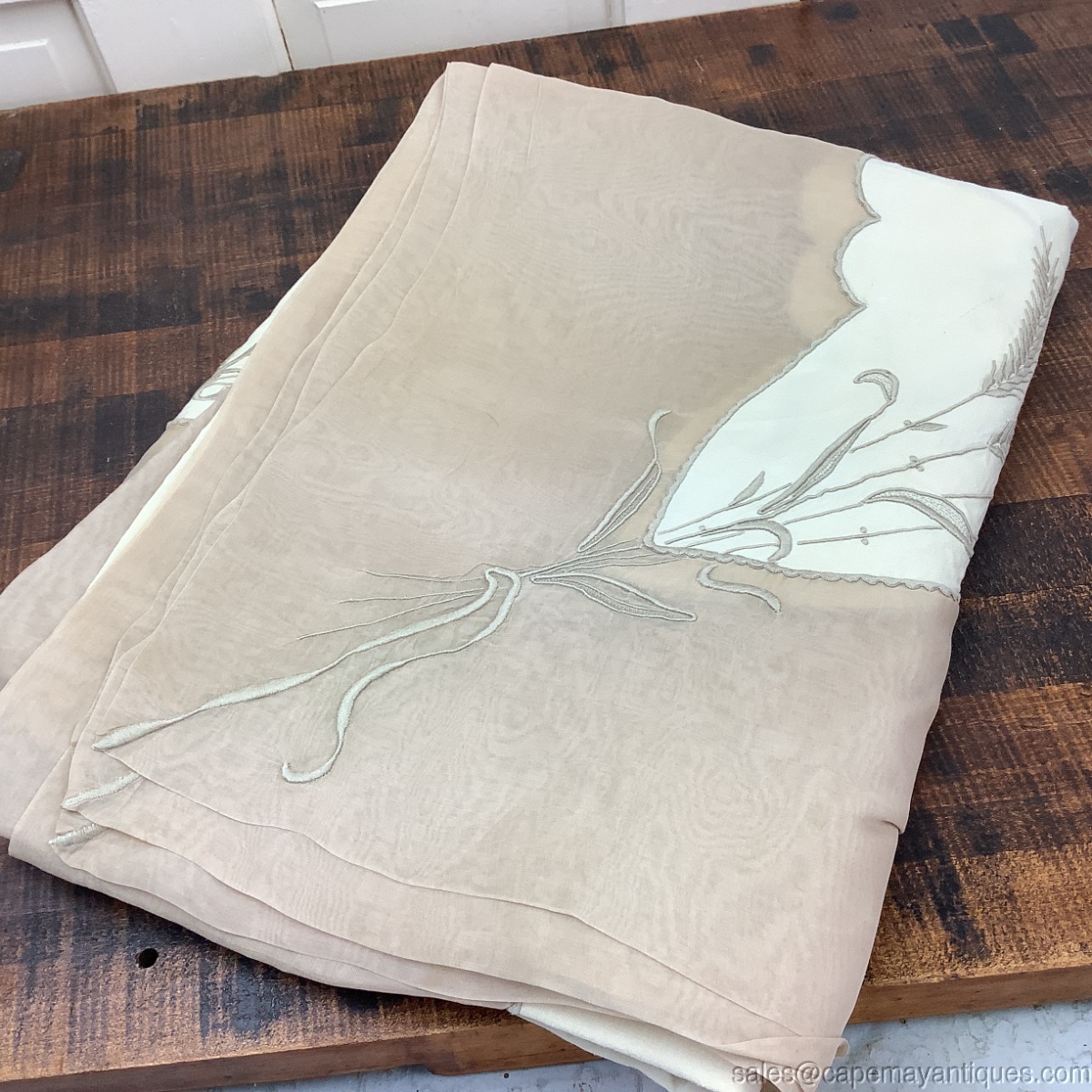 Lovely vintage, large tablecloth with 12 matching napkins. Tablecloth is 108" long by 68" wide. The napkins are 20" by 20". 8" wide chiffon border on the tablecloth in a pretty light beige, almost champagne color. Puff stitch needlework with silver thread creating wheat and wheat sheath patterns. Tablecloth is a stiff linen material. Damage includes 2 napkins having light spots, tablecloth has a few small orange spots, small like dots, and very minor marks here and there. No rips, tears, holes or smells. Protected with acid tissue paper in center of folded tablecloth. Pretty!