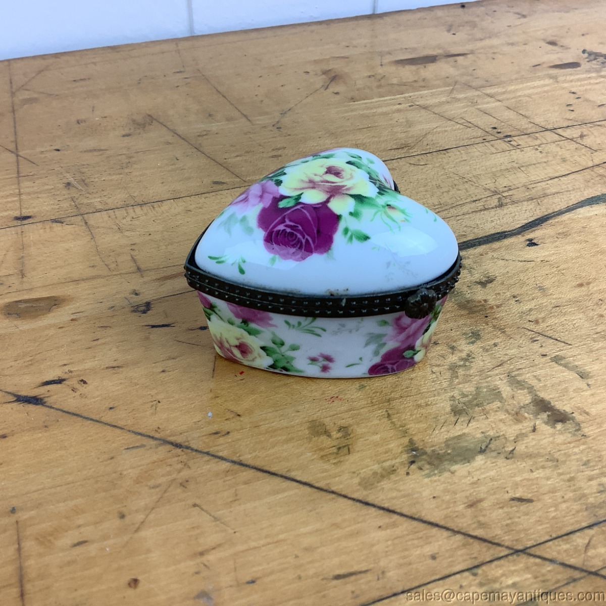 Gorgeous small porcelain trinket box or ring box in the shape of a heart. 2.25" wide and about 1.75" tall. Clasp opens and closes tightly. Pretty pink, yellow and fuchsia shaded roses on white background. Even a small flower on inside top of lid. Good condition with no damage.