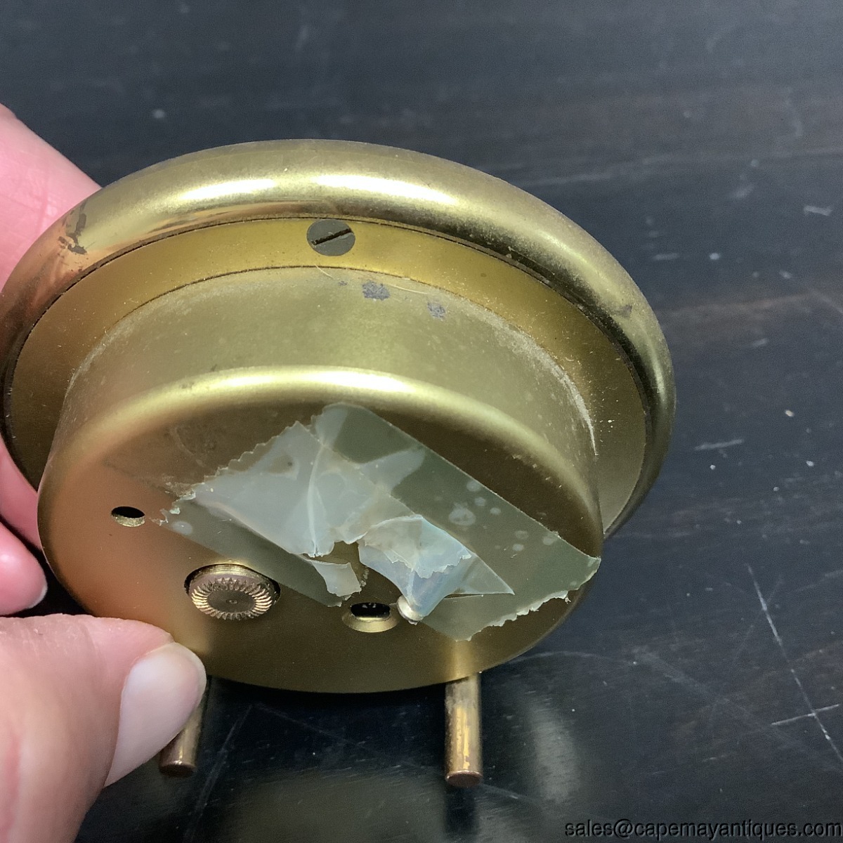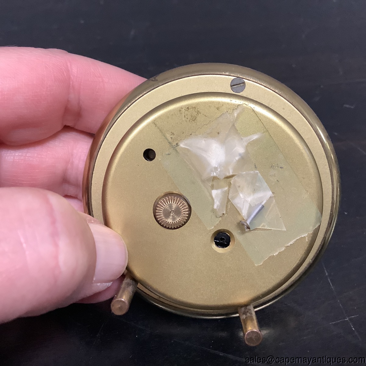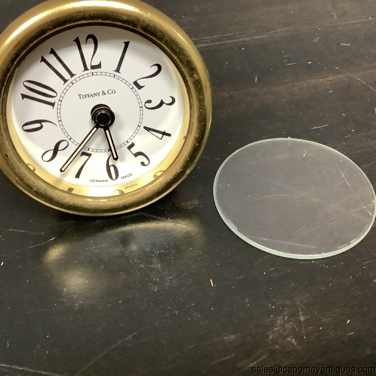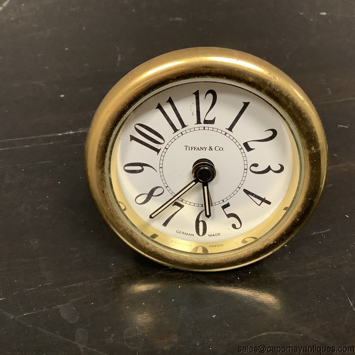 Lovely vintage Tiffany & Co. German Made petite travel or desk clock. Trimmed in gold case, metal with glass face and American numbers, nice and big size. The clock is 2.75" wide. The glass cover needs to be re-attached and it is not working. We purchased and there was a small screw glued onto the back that we are sending. Needs TLC. Really not sure if it can be fixed. Nice looking, quality Tiffany travel or desk clock.