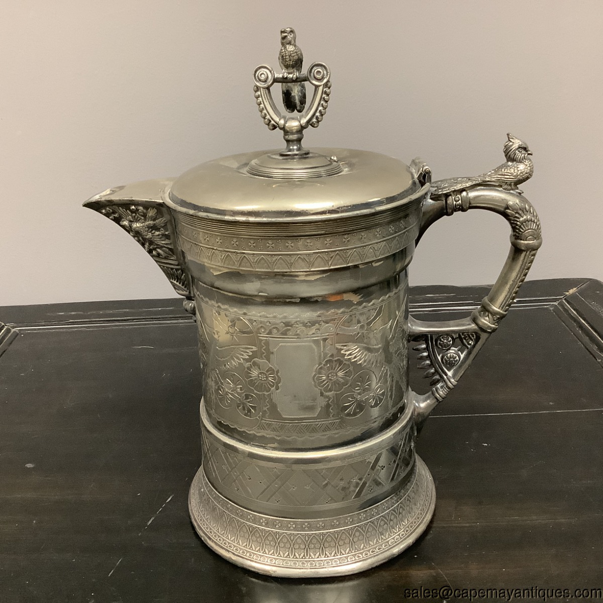Stunning antique ceramic lined tankard, water pitcher. Victorian era, aesthetic in design featuring amazing pattern of birds and bird figures situated on finial lid, top of handle and relief design on either side of spout. White ceramic lining to keep water cool. Bottom signed Simpson Hall Miller. 14" tall by 12" wide with widest section of body without hand and spout is 7" wide. Every inch of this tankard is decorated with bird pattern or art nouveau pattern including fans, circles, flowers etc. There is a lot of peeled off silver plate, no dings or dents. See photos for missing silver plate finish. This is quadruple plate as well. Bird swinging on his perch on the finial lid. Stunning tankard, water or wine pitcher.