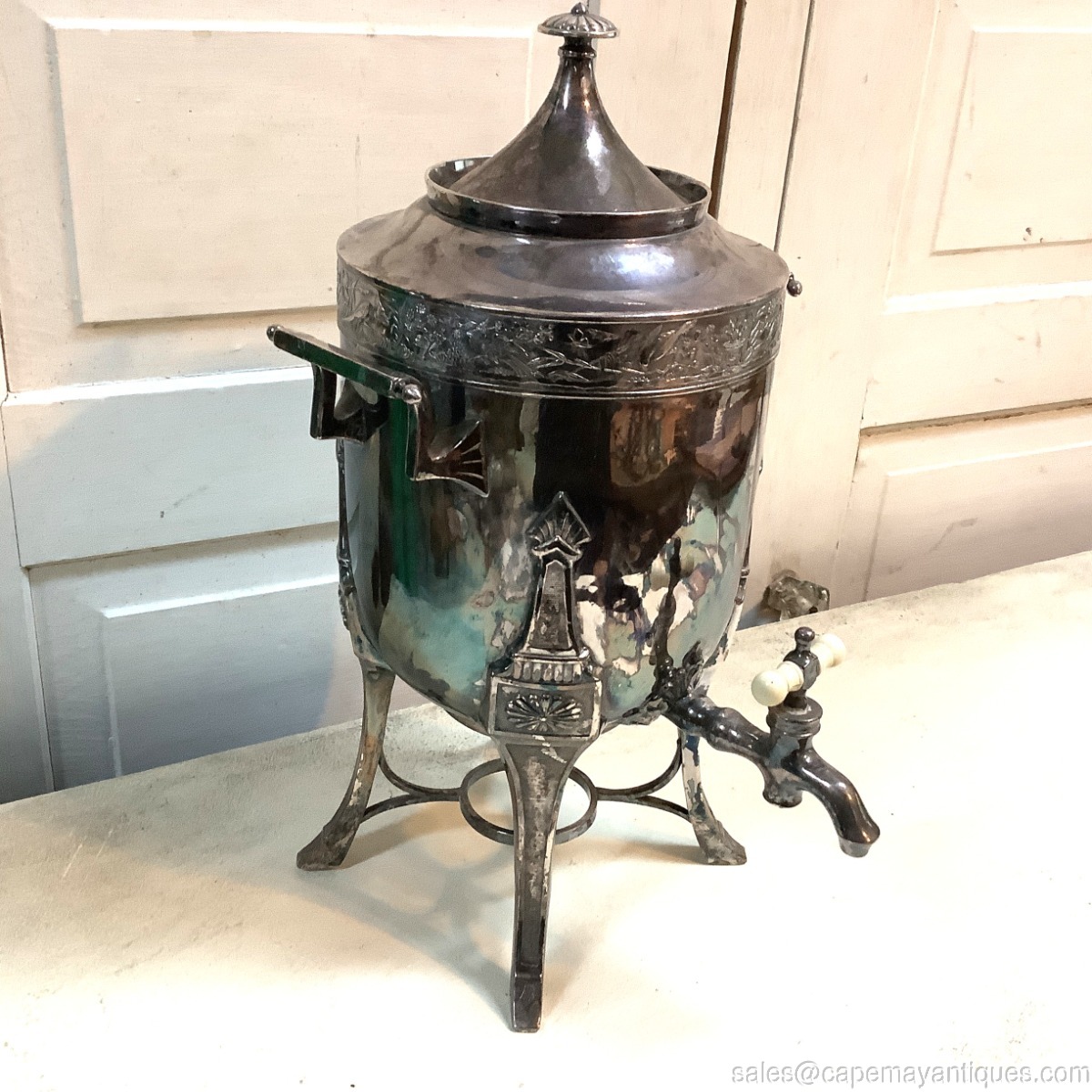 Lovely antique silver plate footed coffee warmer or beverage warmer. This is not an actual maker but a dispenser. Gorgeous tall hoof footed legs with large body and attached front beige colored spigot that is in working order. Love the top trim that features an aesthetic design of birds, urns and florals. There are number marks but it appears as though the maker mark is scratches off. See images. Good quality, good clean interior, no dings or dents. We did not polish and I don't see any loss of silver plate or wearing of same. 15.5" tall by 10" wide by 10" deep if we include the handles and spigot in the measurements.
