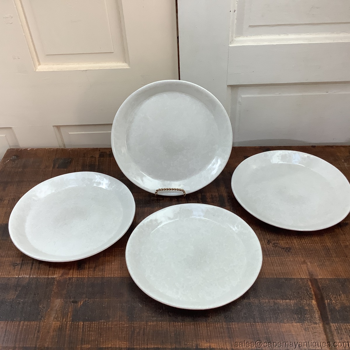 Great set of 4 white on white agate Bennington Potters Pottery dinner plates measuring 10.25"diameter. Impressed Bennington mark and 1669ya mark too. Good condition with no chips or cracks, no utensil marks etc. Thin line on rim of one but I think it is a mfg blemish as opposed to crack.