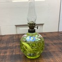 Antique Lime Green Glass Miniature Oil Lamp Hand Painted Flowers Diamond Quilt