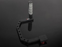 The rig consists of a sturdy c-bracket with an ergonomic grip for filming from the worm’s eye view, to which the various elements are attached via carbon rods with quick-release fasteners. On the c-bracket, the supporting element, you can find the shoulder pad, two rubberized grips, the camera connection plate and the lens screen with barn doors. The follow focus wheel, with which you can set the focus of the lens absolutely precisely, is one of the highlights and emphasizes the pro character. A hinged bracket can be attacked to the side or top of the c-bracket via a 1/4 inch connection, allowing you to connect an external monitor or a recording light.