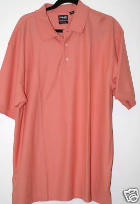 This is a lovely golf shirt and has short sleeves, collar and three buttons. The front button area and shirt sleeve have PING embroidered in the same color thread as the garment. The buttons are white and engraved with PING top and bottom. An XL should fit Neck 17-17.5, Chest 46-48”, Waist 40-42” and is 32” long. The material is 100% Pima Cotton and is machine washable. MSRP $48