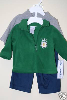This is a real cute outfit. There is a green pullover ½ zip jacket in fleece with a fleur de le in 100% Polyester. There is a gray long sleeve top with a collar and button down ½ way in 100% Cotton. The pants are in blue with a mock zipper in front, elastic back, mock front pockets in 100% Cotton. This product is made in Chine and is machine washable.