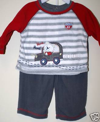 This is a cute little outfit, featuring a long sleeve top that snaps up the back it has red sleeves, white body with gray stripes, and a beat in a car with the words honk honk. The pants are in Gray and have an elastic waist.