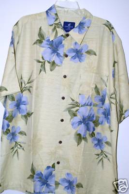 This is a beautiful Caribbean Joe 100% Silk short sleeve shirt with a Hawaiian flower tapestry print. The color of this shirt is yellow with blue flowers and green leaves. The buttons have a island look and there is a pocket on the left hand side of the chest. This is just a very pretty shirt. A 2XL should fit Neck 18-18.5”, Chest 50-52”, Waist 44-46” and the length is 33” long. The material is 100% Silk and is machine washable.