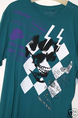 This is a cool crew neck, short sleeve, green tee, from Existential. The front of the shirt has a Design with a skull and writing in black and white. There is no print on the back of the shirt. A large shirt should fit Neck 16-16.5”, Chest 42-44”, Waist 36-38” and is 30.5” long. The material is 100% Cotton and is machine washable.