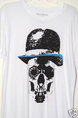 This is a cool crew neck, short sleeve, white tee, from Existential. The front of the shirt has a skull wearing a top hat and has a clock in one eye in black and blue. There is no print on the back of the shirt. A large shirt should fit Neck 16-16.5”, Chest 42-44”, Waist 36-38” and is 27.5” long. The material is 100% Cotton and is machine washable.