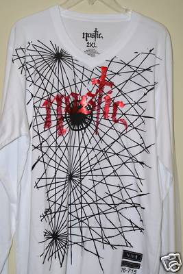 This is a very nice white, V-Neck, long sleeve tee shirt with a black design on the front and NOSTIC in red metallic print. On the bottom there is a square with N-76, another square with NOSTIC 180 and below that 76-715. On the back in big print there is NT76 NOSTIC180. The measurements from armpit to armpit is 50” in circumference and is 31” long. The material is 100% cotton and is machine washable. This product is made in India.