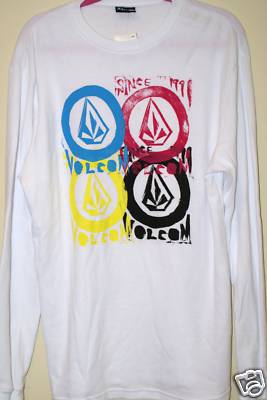 This is a very cute long sleeve thermal tee shirt with Volcom circles in blue, red, yellow and black. The shirt features a crew neck, long sleeves with knitted cuffs. Measurements from armpit to armpit is 50” and is 31” long. The material is 100% Cotton and is machine washable. This product is made in China.