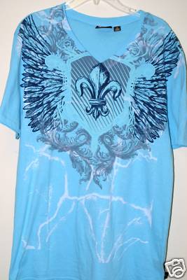 This is a nice V-neck tee shirt with short sleeves. On the front of the shirt is a large fleur de le in blue and blue feathers with designs in gray and white. Measurements from armpit to armpit is 46” and the length is 30”. The material is 100% Cotton and is machine washable. This product is made in El Salvador.