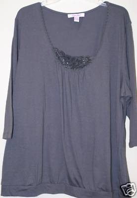 This is a pretty dark gray tee that features a scoop neck with a navy lace insert with sequins and a few gathers beneath the lace. There is a soft lace edge around the neckline. The sleeve are ¾ Length. A 3X should fit Bust 48 ½-52”, Waist 41 ½”-45”, Hips 51-54 ½” and fits a 22-24 and is 27” long with a 1 ½” band around the bottom with is gently gathered. The material is 60% Cotton and 40% Polyester and is machine washable.