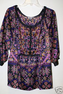 This is a cute blouse with a scoop neck with four covered buttons snapping closed with snaps. There is encased elastic at the shoulders. The colors and print of this blouse are many, so please see the picture for details. There is a band of black satin around the neckline, sleeves, and the front . There are two side pockets. The sleeves are ¾ length and have two buttons. A 1X should fit Bust 40 ½-44”, Waist 33 ½-37”, Hips 43-46 1/2” and fits a 14W/16W and is 23” long. The material is 100% Polyester and is machine washable.