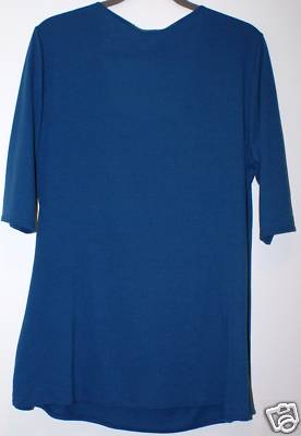 This is a beautiful top in a teal color. The front has a scoop neck and is criss crossed with a buckle detail on one side, giving a slimming effect. The fabric feels like a very soft light sweater type. The sleeves are a short ¾ length just below the elbow. This blouse should fit Bust size 42 ½-45 ½, Waist 34 ½-37 ½, Hips 44½-47 ½ and should fit 18W/20W and has a total length of 29 ½”. The material is 64% Polyester, 33% Rayon, 3% Spandex and is machine washable.