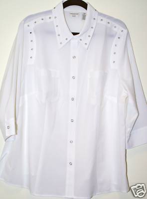 This is a real cute white blouse with snap front and silver grommets at the collar and arm holes. The front of this blouse has two darts on each side and two pockets. The back of this blouse has two darts. The blouse is cut straight across with vents on each side. A size 20W should fit 44 ½-45 ½”, Waist 36 ½-37 ½”, Hips 46 ½-47 ½”, with an overall length of 27”. The material is 94% Polyester, 6% Spandex and is machine washable.