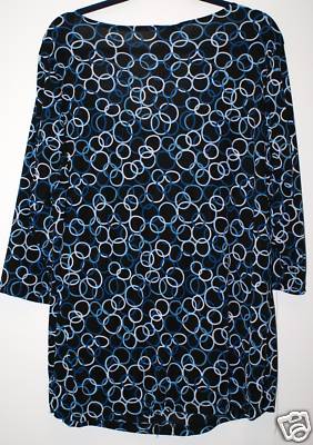 This is a real nice top featuring a square neckline and ¾ length sleeves. The colors in this top are aqua, white, and black in a circular design. This 2X should fit an 18W/20W. This blouse should fit Bust size 44 ½-45 ½, Waist 36 ½-37 ½, Hips 46 ½-47 ½, and is 30” long. The material is 92% Polyester 8% Spandex and is machine washable.