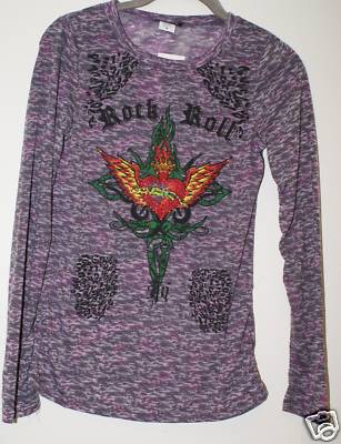 This is a cute junior Lia Lee Tee. The colors of the material are lavendar, gray, purple, black. There is the words "ROCK ROLL and a heart with wings and a crown in red, orange, and yellow, with green accents with yellow and red studs. The neck is a crew neck and it has long sleeves. The measurements armpit to armpit is is 30" in circumference and the bottom is 34" in circumference, the length from back of collar is 24". The material is 65% Polyester, 35% Rayon and is machine washable.