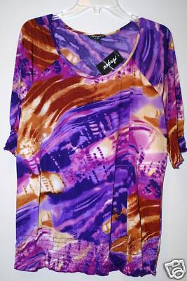 This is a very pretty top with a scoop neck, short sleeves with 6 rows of elastic smocking and a band of elastic smocking at the bottom of the top. Colors in this shirt are purple, gold, rust, yellow and pink in an abstract design. Measurements from armpit to armpit is 52” and is 26” long. The material is 95% Polyester, 5% Spandex and is machine washable. This product is made in China. MSRP $48