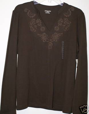 This is a nice very soft long sleeve tee shirt with a V-Neck that has embroidery around it in the same color as the shirt. The measurements from armpit to armpit is 51” in circumference and is 25” long. The material is 100% cotton and is machine washable.
