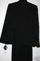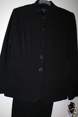 This is a classy beautiful black 2-piece pant suit with stripe in the material. The jacket features long sleeves, a mandarin collar, two faux pockets, just flaps, and 5 buttons up to the mandarin collar for a military look. The front and back of the jacket features princess seams and is 25” long. The jacket has light shoulder pads that could be removed. The pants have no waistband, elastic in the back for a comfy fit and a zipper with a hook and eye on one side. The pants have two darts in the front. The inseam of the pants is 32” long. The jacket and pants are unlined and is machine washable. The material is 95% Polyester and 5% Spandex. A size 8 should fit Bust 35-36”, Waist 27-28”, Hips 37 ½-38 ½”.