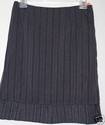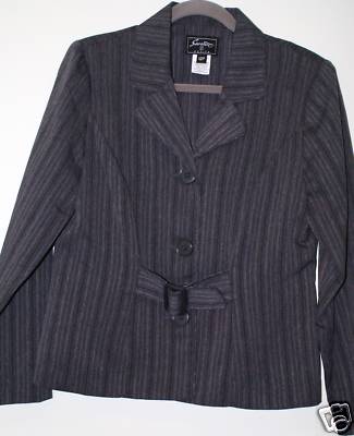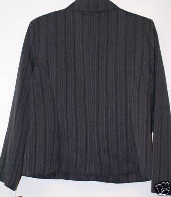 Very cute and classy jacket and skirt in a beautiful gray with a black stripe and white lines. The jacket has 3/4 length sleeves with a collar, lapels, three buttons and a buckle and is 23” long. The jacket has princess seams in front and back. The skirt is a straight skirt with 3 ½” of pleats on the bottom. The skirt has no waistband and a zippered back with a hook and eye closure. The front and the back of the skirt have two darts. The length of the skirt falls just below the knee and is 23” long. The jacket and skirt are unlined and machine washable. A size 12P should fit Bust 37-38”, Waist 29-30”, Hips 39-40”. The material is 100% Polyester.