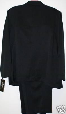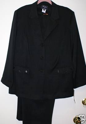 Wow, this is a nice suit, Jacket and pants. The jacket features Collar, Lapels, and three buttons. There are two mock pockets with flaps with three buttons. The jacket has princess seams, front and back. The jacket has light shoulder pads that can be removed easily. The overall length of this jacket is 28 ¼” long. The pants front has a 1 ½” waistband, and two darts in the front. There is a side zipper with a hook & eye closure, the back has an elastic waistband. The inseam is 31” long and the pants have a nice crease. . A size 24W should fit Bust 48 ½-49 ½”, Waist 40 ½-41 ½”, Hips 50 ½-51 ½”. The Jacket and skirt are unlined and is machine washable. The Material is 100% Polyester.