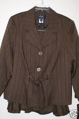 This is a nice brown suit with a woven material that has vertical lines in a lighter thread. The jacket has a collar, lapels, long sleeves, three buttons and a tie front. The jacket has light shoulder pads that are removable. The jacket measures from armpit to armpit 54” and is 24” long. The skirt has no waistband, a back zipper with a hook and eye closure. The skirt is a straight skirt with a 3.5” ruffle at the bottom of the skirt for a feminine look. Measurements of the waist is 46” in circumference and is 22” long. Both the jacket and the skirt are unlined and are machine washable. Material is 100% Polyester and is machine washable.