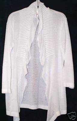 This is a beautiful light gauge sweater featuring a ruffled front and long sleeves with ribbed detail on the front panels. This sweater has no button or tie closure but is flowing nicely in front. The ruffled front runs all the way around the front and the neck for a soft feminine look. A large should fit Bust 38 – 39 ½”, Waist 29 ½ - 31”, and hips 39 ½ to 41” and is 30.5” long. The material is 85% Acrylic, 15% Nylon and is machine washable.