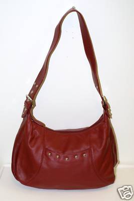This is a very pretty red leather purse featuring a adjustable handle with silver accents and a 13” drop. One side of this purse has a pocket with silver stud details. The top opening is zippered with a leather pull. Inside is lined in black fabric and has a zippered pocket on one side and two pockets on the other side. The measurements of this purse are 9” high, 14.5” wide and 4” across the bottom.
