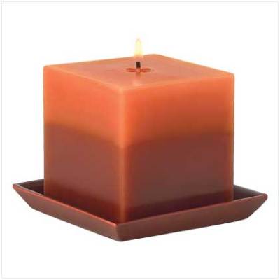 squared candle; when lit, a scrumptious pumpkin spice scent enlivens the