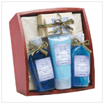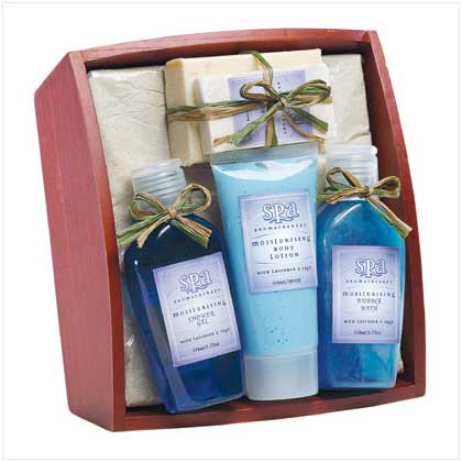 A tasteful, polished wood tray contains a full line of lavender and sage scented bath products. Appealingly accented with ribbons and bows! Includes shower gel, bubble bath, body lotion, and 2 bars of soap. 7 1/2" x 2 3/4" x 7 1/2" high.